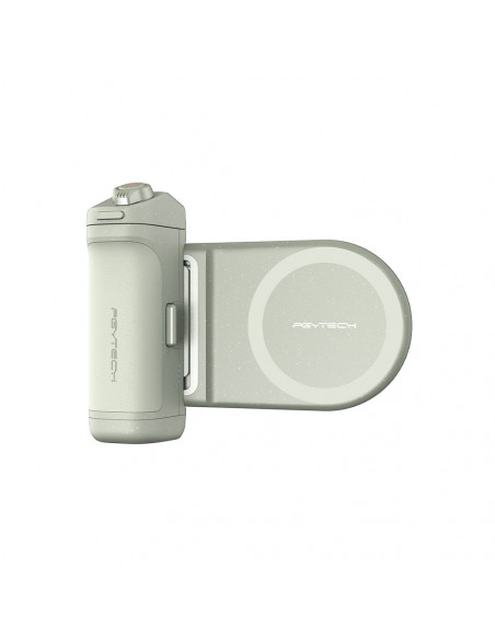 Elevate your shooting effortlessly The PGYTECH MagCam Phone Grip(Mint Green) is a versatile modular grip designed for smartphone photography enthusiasts, providing a camera level shooting experience. A quick release mechanism allows it to be separated into three parts: Magnetic wireless charging module/Bluetooth remote control module/Charging grip module. Highlights Modular design Quick release mechanism Power bank functionality Modular design The bluetooth remote control, charging handle and stand modules can be detached and used independently. Quick Release mechanism The grip and stand connect seamlessly with a slide in design and can be quickly released with a single button. 5W wireless charging The charging grip transfers power to the stand via PIN connectors, while the wireless charging coil powers the smartphone. EDC friendly design Just 3.5mm thick (5.5mm at its thickest point) and weighing 48g, the stand has rounded corners for comfort and minimises size when attached to the phone. Landscape and portrait stand functionality A metal stand supports angles up to 58°, suitable for iPhone 12 series and newer devices in both directions. Power bank functionality Equipped with a built in 3000mAh 18650 battery, the grip includes a Type C port that functions as both a charging and output port, delivering 10W of power. Users can directly connect a cable to charge their phone. , Materials: ABS+PC, aluminium alloy, zinc alloy Weight: 145g Magnetic standard vertical suction: 18N Battery capacity: 3000mAh Rated capacity: 2100mAh Type C input: 5V/2A Type C output: 5V/2A Wireless charging output: 5V/1A PIN output: 5V/1A Battery indicator: The handle has four LED indicators that light up sequentially from bottom to top, for battery levels of 25% / 50% / 75% / 100%. , 1 x Magnetic wireless charging module 1 x Rechargeable handle module (with remote control) 1 x Magnetic ring 1 x Lanyard 1 x User guide