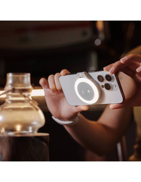 A magnetic fill light for your phone The PGYTECH MagGlow Phone Fill Light (Misty Gray) is a magnetic fill light designed for phone photography enthusiasts, providing extra illumination in low light conditions. The light has a magnetic base so users can easily attach it to the back of MagSafe compatible phones, phone cases or use it with the PGYTECH MagCam Phone Grip. Highlights Slim design Button controlled brightness Three colour temperatures Magnetic attachment The base of the fill lamp is designed with magnets, making it easy to attach to MagSafe compatible phones or phone cases. It can also be magnetically attached to the PGYTECH MagCam Phone Grip. Ring shape design The fill light is designed in a ring shape to add a dazzling âeye sparkleâ to make any selfie shine with captivating charm. It has a hinge that allows it to rotate up to 290° with smooth, stepless adjustment. It is powered by a built in 300mAh lithium battery and charged via the Type C port on the bottom. With 34 bright LEDs, it offers 30 minutes of continuous illumination. Button controlled brightness After switching on, a short press of the power button lets you cycle through three colour temperature settings, while a short press of the brightness button lets you cycle through three brightness levels (15%, 50%, 100%). Slim design The biggest advantage of this torch is its slim profile. At just 10.5 mm thick, it is much thinner than most comparable magnetic refill lamps on the market, which are usually around 14 15 mm, making it exceptionally light and portable. No Coating Process The fill light uses a no coating process, creating a paint spatter effect on the surface., Weight: 37.6g Main material: ABS+PC Type C Interface input: 5V/1A Battery capacity: 300 mAh Rated voltage: 3.7V Rated output: 1.1Wh Maximum rotation angle: 290° , 1 x PGYTECH MagGlow Phone Fill Light 1 x Magnetic ring 1 x User guide