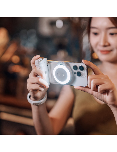 A magnetic fill light for your phone The PGYTECH MagGlow Phone Fill Light(Classic Black) is a magnetic fill light designed for phone photography enthusiasts, providing extra illumination in low light conditions. The light has a magnetic base so users can easily attach it to the back of MagSafe compatible phones, phone cases or use it with the PGYTECH MagCam Phone Grip. Highlights Slim design Button controlled brightness Three colour temperatures Magnetic attachment The base of the fill lamp is designed with magnets, making it easy to attach to MagSafe compatible phones or phone cases. It can also be magnetically attached to the PGYTECH MagCam Phone Grip. Ring shape design The fill light is designed in a ring shape to add a dazzling âeye sparkleâ to make any selfie shine with captivating charm. It has a hinge that allows it to rotate up to 290° with smooth, stepless adjustment. It is powered by a built in 300mAh lithium battery and charged via the Type C port on the bottom. With 34 bright LEDs, it offers 30 minutes of continuous illumination. Button controlled brightness After switching on, a short press of the power button lets you cycle through three colour temperature settings, while a short press of the brightness button lets you cycle through three brightness levels (15%, 50%, 100%). Slim design The biggest advantage of this torch is its slim profile. At just 10.5 mm thick, it is much thinner than most comparable magnetic refill lamps on the market, which are usually around 14 15 mm, making it exceptionally light and portable. No Coating Process The fill light uses a no coating process, creating a paint spatter effect on the surface. , Weight: 37.6g Main material: ABS+PC Type C Interface input: 5V/1A Battery capacity: 300 mAh Rated voltage: 3.7V Rated output: 1.1Wh Maximum rotation angle: 290° , 1 x PGYTECH MagGlow Phone Fill Light 1 x Magnetic ring 1 x User guide
