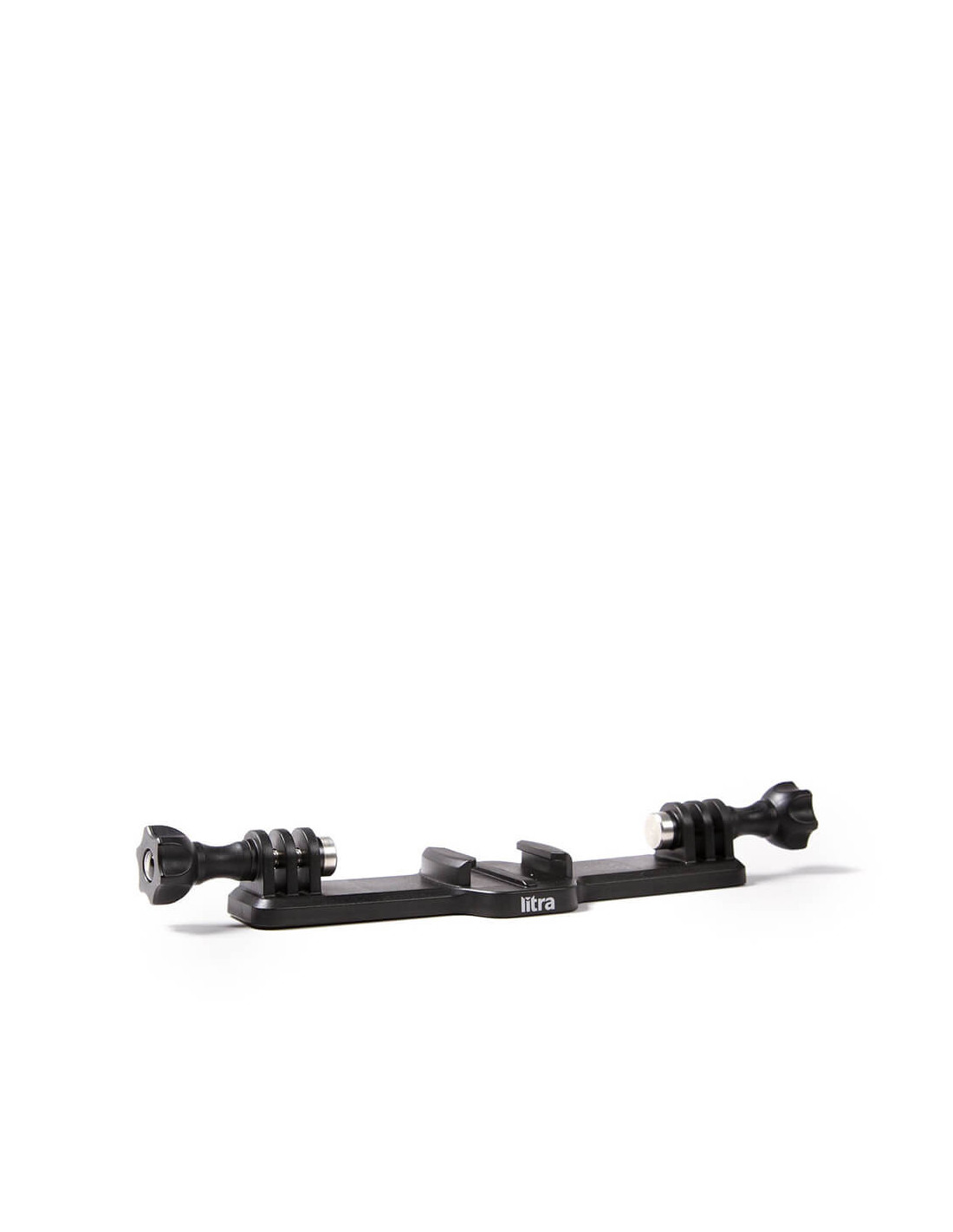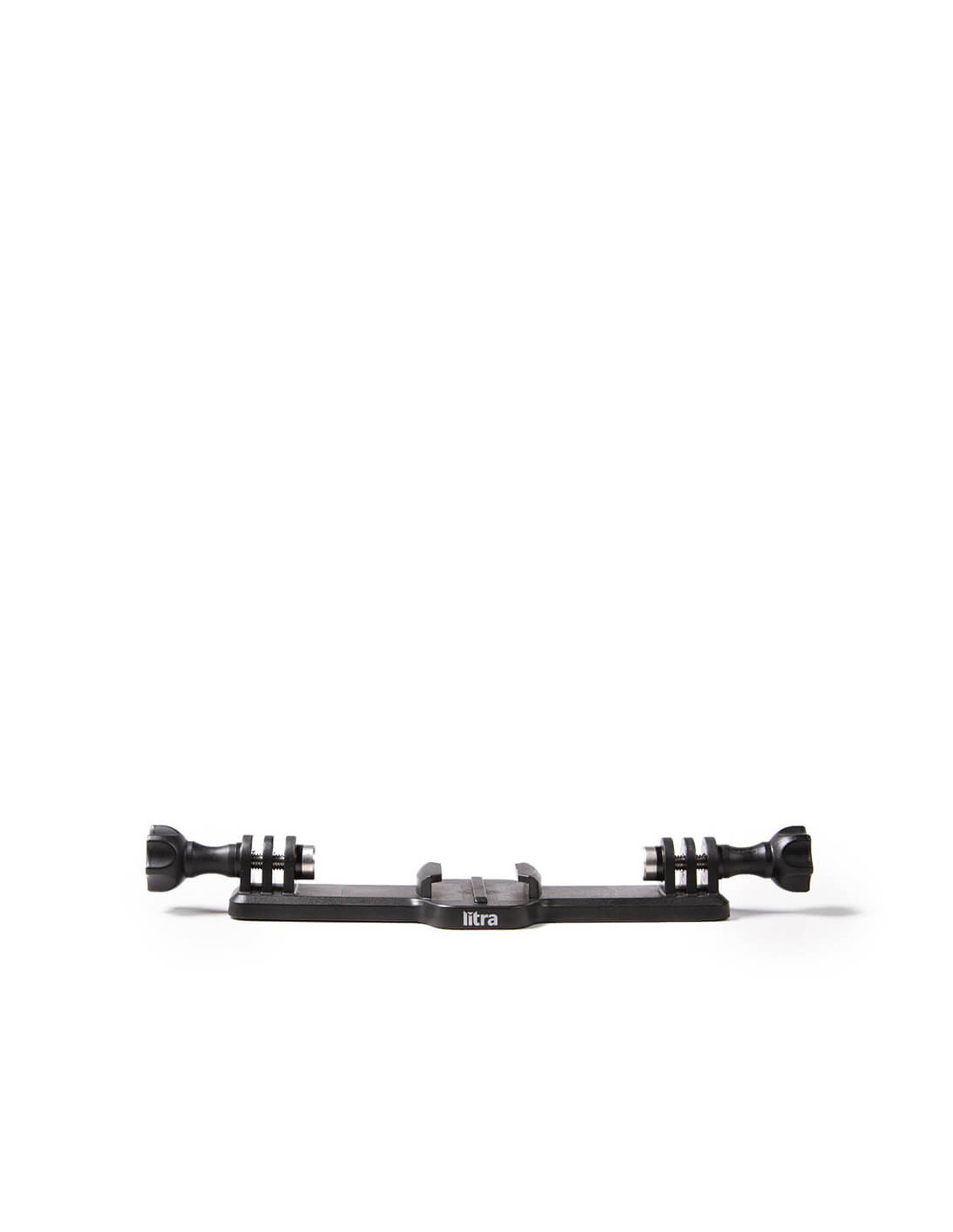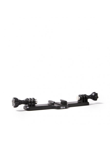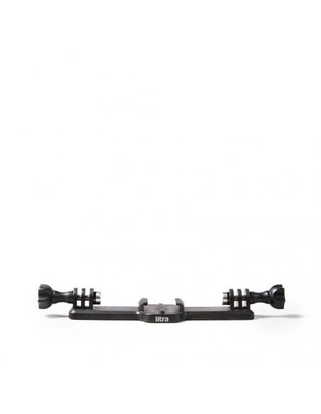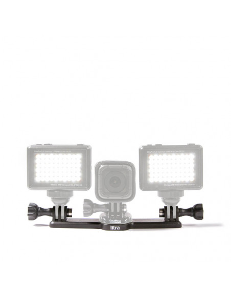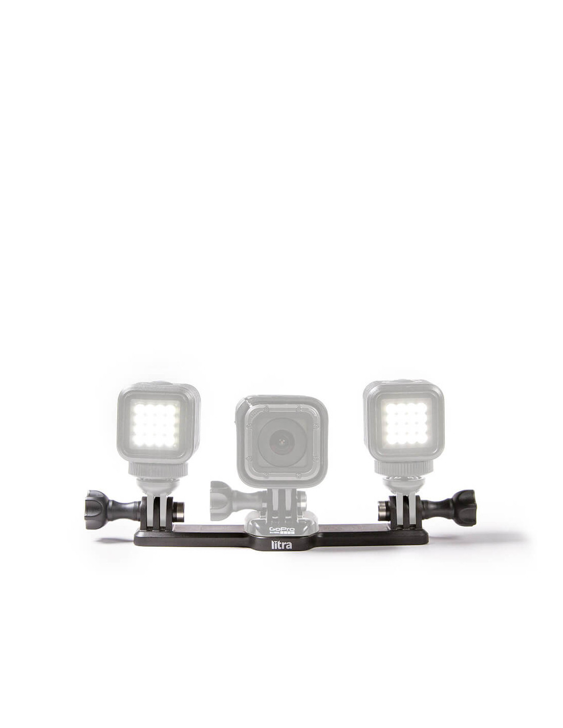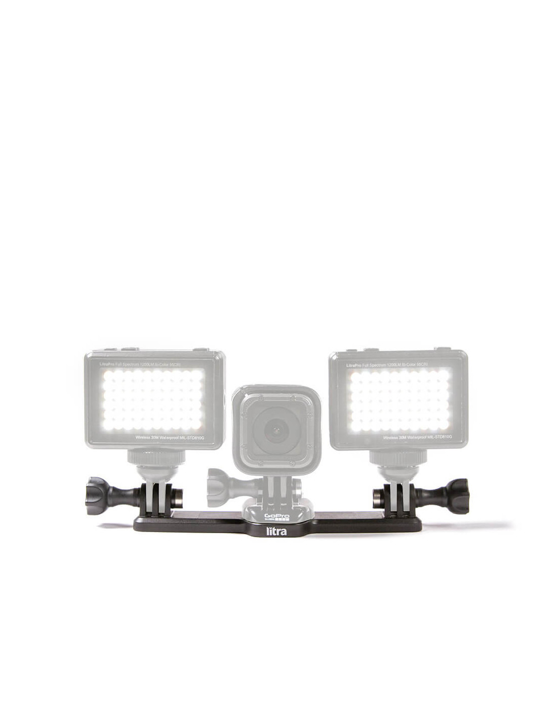 Triple Beslag Det tredobbelte beslag kan monteres på ethvert stativ eller andet universelt 1/4" 20 system Din LitraTorchesTM eller LitraProsTM (eller 1 af hver!) Kan monteres på Triple Mount med et GoPro fingermonteringssystem. Din GoPro er udstyret med et GoPro shoe beslag. Bemærk! GoPro-monteringer er ikke inkluderet i Triple mount, men er inkluderet i hver LitraTorch / LitraPro.