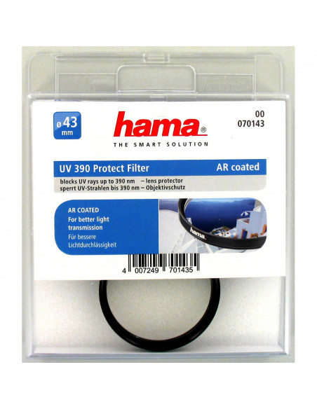 En god permanent beskyttelse af objektivet, der samtidig absorberer de ultraviolette stråler som ofte er fejlkilden når billeder optaget udendørs bliver diffuse og uklare. Fakta Et uundværligt universal filter med 2 lags coatning på begge sider af glasset Farveløst, afskærer UV-stråler indtil 390nm Den uskarphed og dis, som skyldes de usynlige ultraviolette stråler, filtreres bort Resultatet bliver klare, skarpe optagelser både i farve og sorthvid Beskytter mod støv og snavs