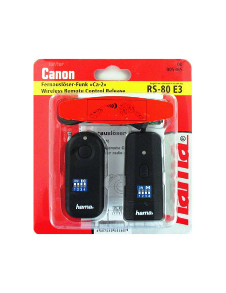 - Wireless remote control release (4channel 433 MHz) for Canon DSLR cameras with RS-80-N3 connection - With serial release and time exposure (bulb) - Range: up to 30 metres (also through the wall) - Very easy installation of the receiver via the remote input - Two-stage release button (autofocus, release), for time exposure the release has to be pressed for 3 seconds - E.g. suitable for: - Canon 5D Mark II/1Ds Mark III/1Ds Mark II/1Ds/1D Mark II/1D Mark III/1D Mark IV/1D/EOS 50D/40D/30D/20D/10D/7D/5D/1V/EOS 3 - Kodak DSC 520