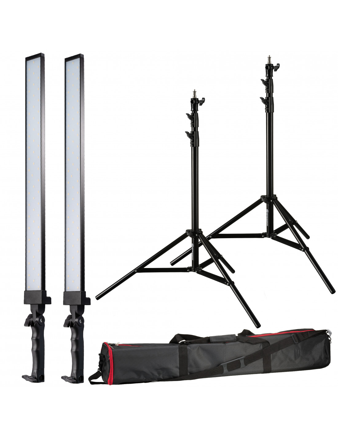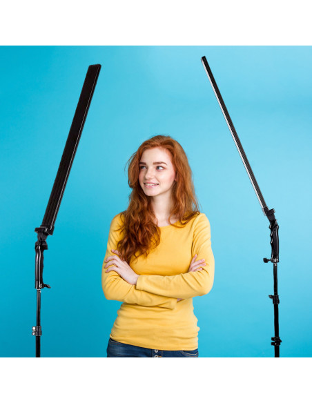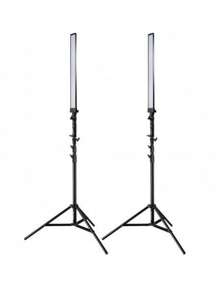_x000D_ Removed from the tripod, the LED slimlights can be easily carried along on the practical hand grip. The flicker-free Photo LED BRESSER Striplights provide sufficient daylight temperature at a colour temperature of 5500 K over a length of 83 cm. With the dimmer, the light intensity can be continuously adjusted from 0 to 100 % to suit individual conditions without having to constantly move the tripods. The easy-to-use all-inclusive LED Striplight Set comes in the size of a sports bag and the accompanying air-suspended lamp tripods can be extended up to a height of 220 cm.