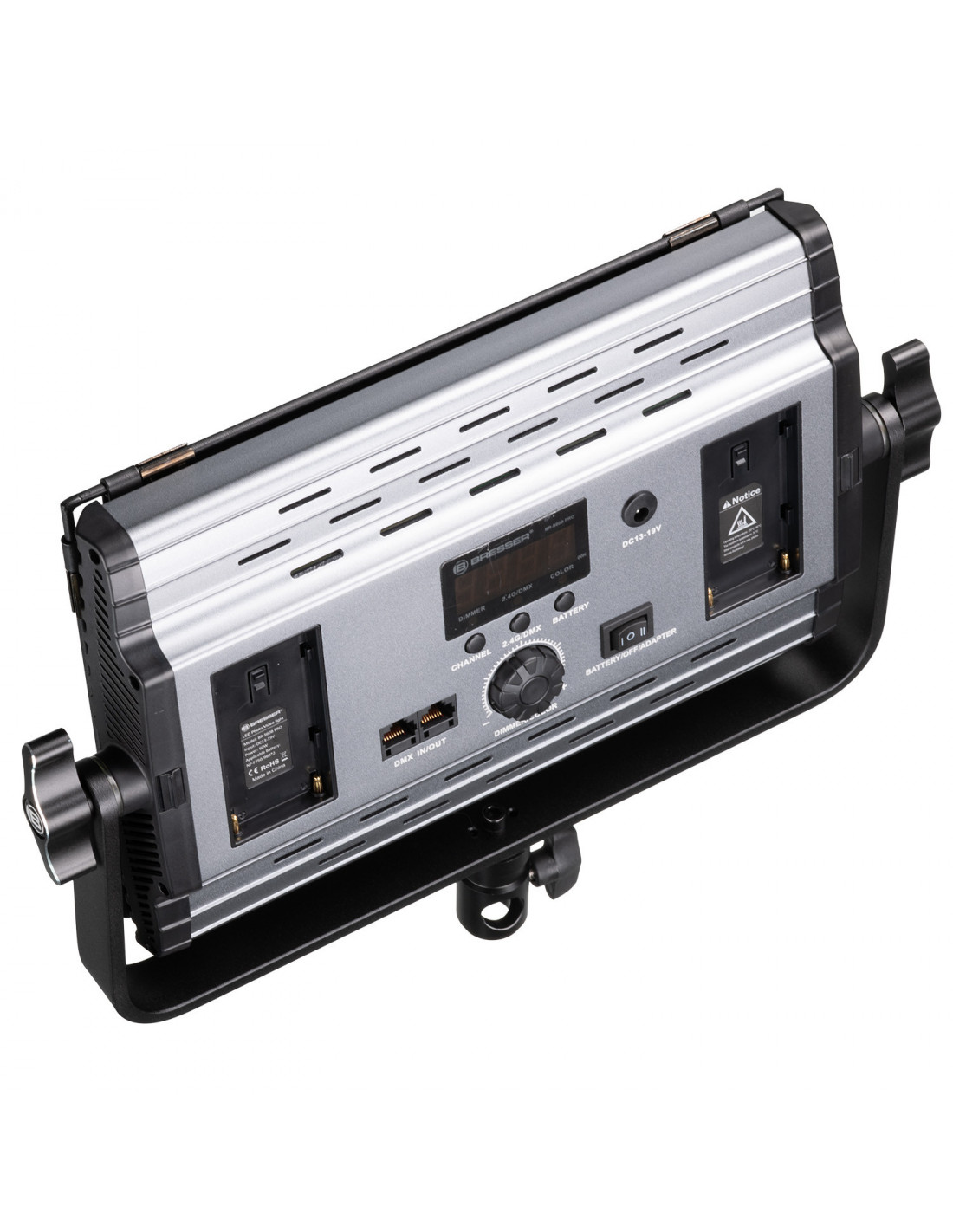 _x000D_ With the U-bracket, the LED video panel is mounted on lamp tripods with spigot connection and perfectly aligned and focused through the barn doors. The BRESSER BR-S60B PRO offers more flexibility thanks to the different power supply options, either by mains adapter or optional NP-F750 batteries. An handy 2.4 GHz remote control offers the possibilty to control up to 99 lamps up to a maximum distance of 50 m.