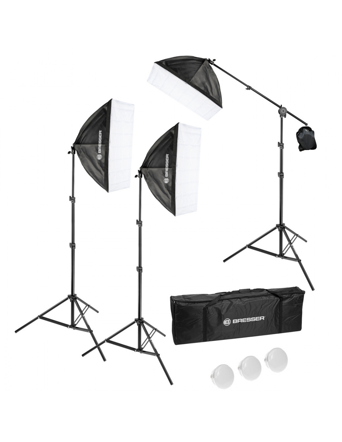 _x000D_ In the studio or on location, you are immediately ready to go with this set. It consists of three 50 x 70 cm umbrella softboxes including external diffuser, three tripods with a maximum height of 75 to 180 cm and an extension arm with connecting piece.