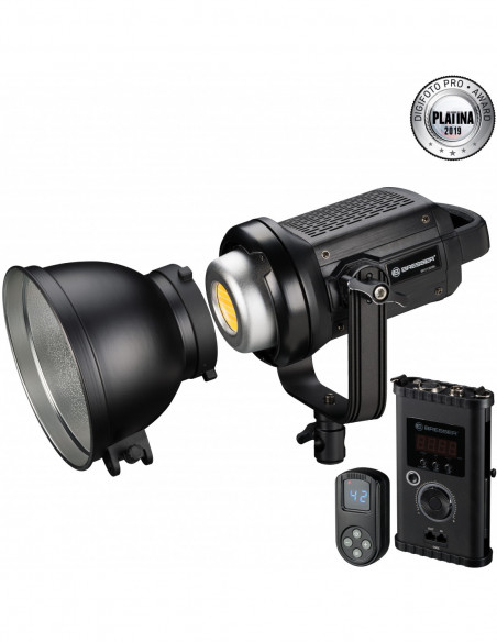 The BR-D1200BL is a 120 Watt COB (Chip on board) dual-colour LED lamp with a precise colour fastness of CRI >95. It has a total light output of 10800 lumen and an adjustable colour temperature of 3200K to 5600K. The BR-D1200BL has a robust design and is intended for professional applications. Thanks to the cooling system with a fan, the lamp stays cool even during longer periods of use, without increased noise. For ease of use, the lamp is equipped with a tiltable U-mount for securing to a lamp stand, a stable design and precise configuration options. The Bowens connection allows to you use light shapers. A lamp reflector is included in the packaging.