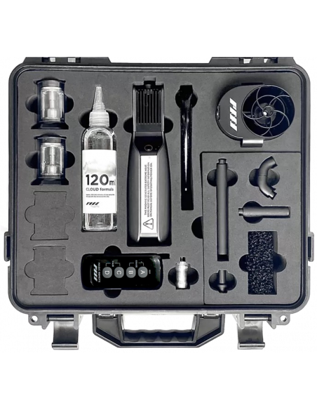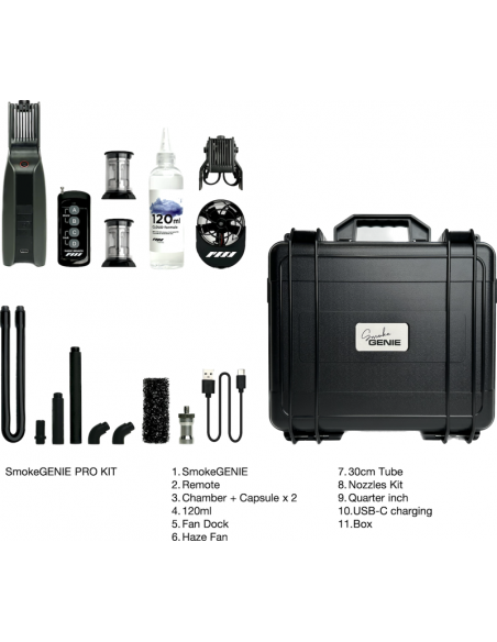 SmokeGENIE Professional Kit er en alt-i-en, håndholdt enhed, der giver uafhængige skabere mulighed for tåge-, dis-, low-hang-tåge- og tøris-effekter og giver øjeblikkelig røg hvor som helst og når som helst. Du kan hurtigt dise et rum op for at skabe en filmisk atmosfære eller bruge den udendørs til produktioner med barske optageforhold.Ud over SmokeGENIE-enheden indeholder Professional Kit en trådløs fjernbetjening, to udskiftelige røgkamre, en cinematic haze fan-adapter, fire præcisionsdyser til røgformning, en dyse til flydende røg og et 12" silikoneforlængerrør. Der medfølger Cloud Formula-væske, så du kan komme i gang med det samme. Der medfølger tre 18650 li-ion-batterier og et 23A-batteri til at drive SmokeGENIE og fjernbetjeningen. Opbevar din SmokeGENIE og tilbehør sikkert, når du rejser, med den medfølgende beskyttende hårde taske.Alt-i-én alsidighed.Med i alt 25 forskellige strømtilstande giver Smoke GENIE dig mulighed for at skabe unikke typer røg, herunder tæt tåge, atmosfærisk dis, flydende røg, der opfører sig som tøris, damplignende jetpulser, stillestående skyer og meget mere.Lav røg på svære steder.SmokGENIEs størrelse gør det muligt at placere den på de mindste og mest trange steder. Bestem præcis, hvor du vil have din røg, og brug den indbyggede fjernbetjening til hands-off-betjening for at opnå visuelt slående effekter.Brug røg med en præcision, du aldrig har set magen til.SmokeGENIE er ideel til portræt-, miniature- og madfotografering og leveres med en særlig præcisionsdyse, som du kan bruge til at påføre røg med nøjagtighed, når du arbejder på trange, små steder.Røgformelvæske, der er uskadelig for mennesker og tøj.SmokeGENIE Cloud Formula Fluid er sikker, lugtfri, miljøvenlig og baseret på en fødevaregodkendt formulering.**Lille, håndholdt røgmaskine med kraftfulde funktionerFilmisk tåge med lang hængetid: 10 til 15 minutter (med ventilation), 30 til 45 minutter (uden ventilation)Nul vente-/kogetidKammerkapacitet: 9 ml500 kubikfod pr. minutNem genopfyldningsfane, en fuld tank giver 10 minutters røgSmart interface med 25 strømtilstandeFjernbetjening til hands-off-betjeningHoldbart og udskifteligt røgkammerBruger genopladelige 18650-batterier af industristandard - få øjeblikkelig strøm, når den startesUSB-C hurtig opladningCloud Formula Væskesammensætning: VG (vegetabilsk glycerin) + PG (propylenglycol)**I æsken1 x SmokeGENIE 2023-model2 x forstøvende røgkammer1 x håndholdt magisk fjernbetjening1 x 120 ml Cloud Formula væskepåfyldning1 x silikoneforlængerrør (30 cm)Præcisionsrøgformende dyser (4 stk.)1 x dyse til flydende røg1 x Jet Tip-dyse1 x fjernbetjent Haze Fan-tilbehør1 x USB-C opladningskabel1 x ¼ tommer spigot-adapter1 x beskyttende hardcase