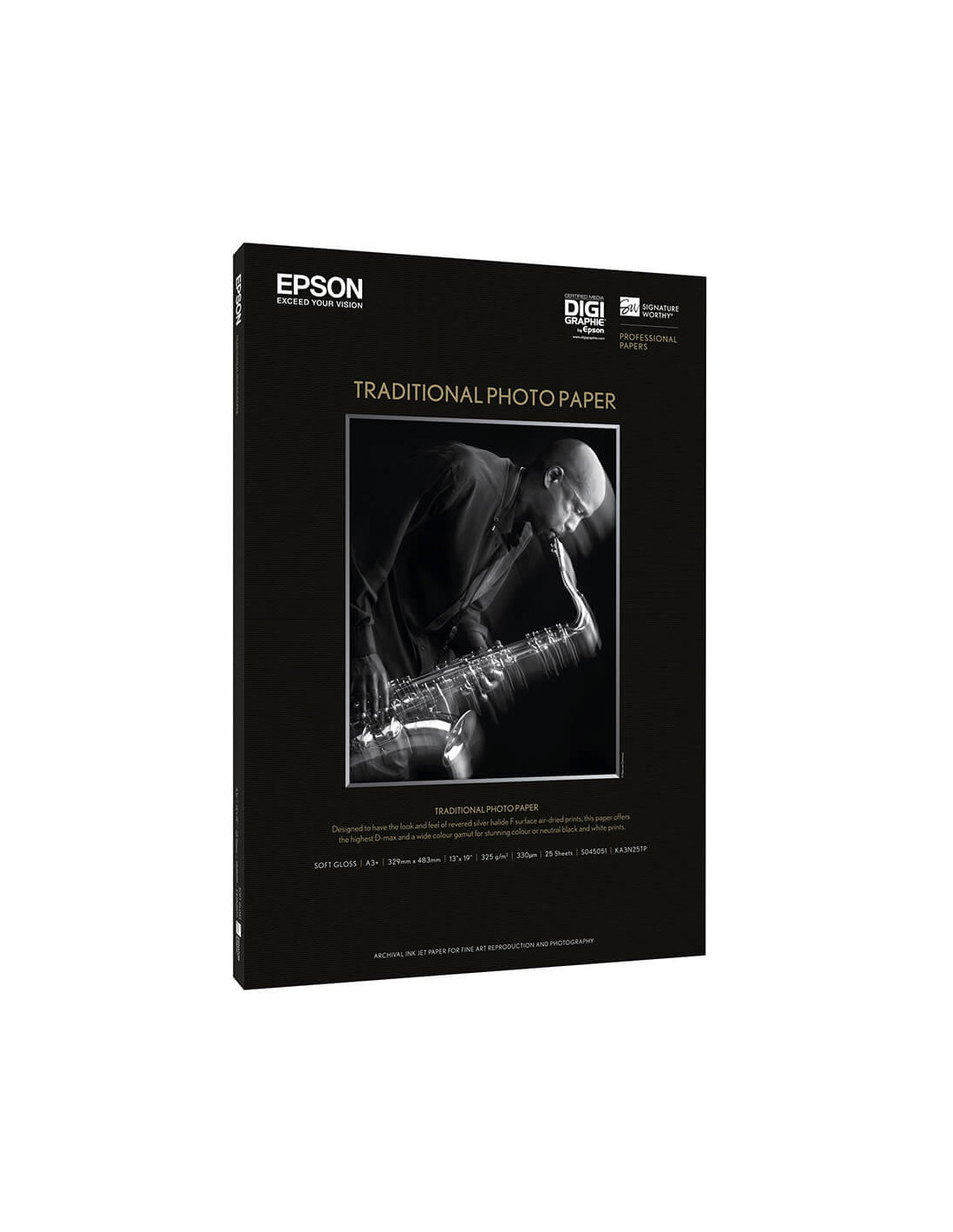 Traditional Photo Paper, DIN A3+, 325 g/m², 25 ark Det har en fiberfotopapirbasis på 300 g/m², en 13 mil. tykkelse, syre- og ligninfrit, mikroporøs, satineret overflade (F-type) med minimal forskel i glans. Endvidere har det en ekstrem høj D-Max, stort farverum og tørrer straks. Epson Traditional Photo Paper er et gennembrud inden for papirfremstillingen. Det er udviklet til eksklusivt brug sammen med Epsons UltraChrome K3-blæk og i samarbejde med mange af de førende professionelle fotografer inden for branchen for at sikre, at det kan leve op til de største krav.Mange af dem, der har været med til udvikling af Tradtional Photo Paper, har bemærket, at det minder dem om de værdsatte sølvhalogenmedier samt giver større kreativ kontrol på grund af den usædvanlige D-Max og toneværdiovergangen i sort-hvid. Endvidere kan du udskrive fantastiske farver på samme papir, hvilket ikke var muligt med det traditionelle fiberbaserede papir.Ved at kombinere kunstformen traditionel fotografi med den digitales enkelthed og kontrol giver dette enestående medium de samme dybe sorttoner, fine toneovergange og holdbare resultater, som mørkekammerpapirerne fra de tidligere generationer leverede. Dets fiberbasis har en udtryksstærk overflade, en ensartet farvedybde og en blød glans, ideelt til den fornemme farvegengivelse eller fremstilling af neutrale sort-hvide prints, som bibeholder de traditionelle fiberpapirers udseende og overflade.Som alle nyudviklede medier fra Epson er dette papir produceret til at levere den bedst mulige opløsning og farvemæthed. Som altid garanterer Epsons forbrugsmaterialer Epson-kvalitet.