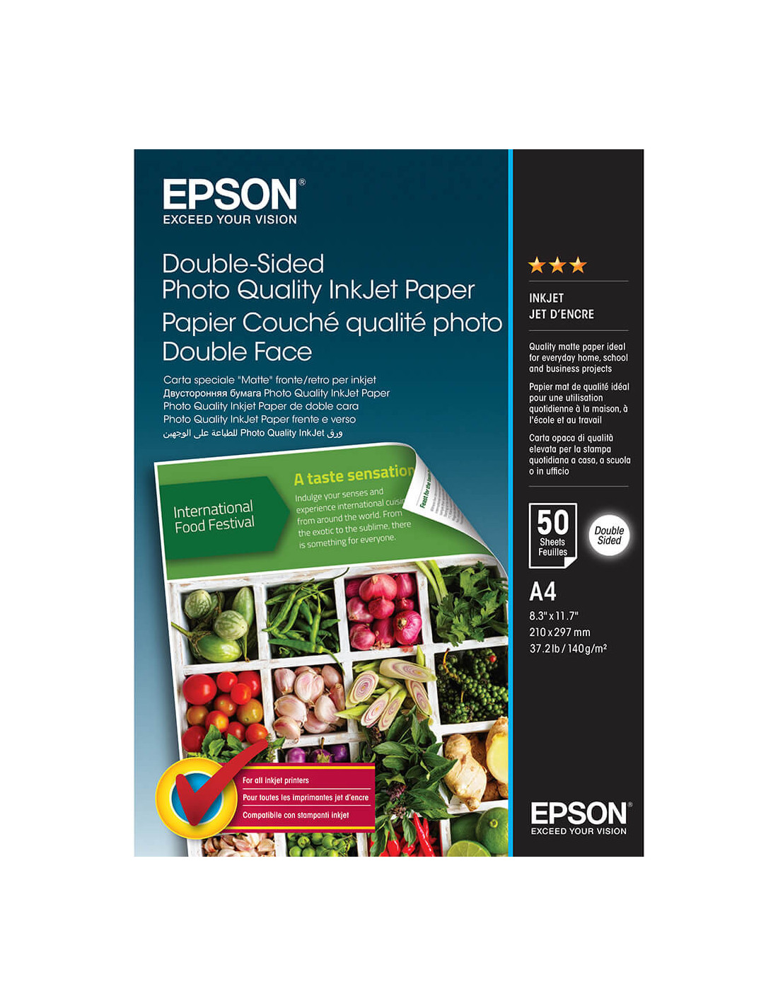 Bring your images and text to life with our double-sided Photo Quality Inkjet Paper. Thanks to its higher weight, this paper is ideal for printing on both sides and especially for documents that emphasize images. Its matte surface gives it a superior feel suitable for printing special documents. High print quality You spend time on your work, so let it shine with our double-sided, matte, white, 120 g/m2 Photo Quality Inkjet Paper. Even when printing on both sides, this smooth and refined paper has been designed to produce highly detailed and colorful high-resolution images and crisp, clear text. You can trust it to produce great newsletters, flyers, brochures, homework, etc. Optimized for Epson printers Epson inks and papers have been developed to provide optimal results when used with Epson printers. Great for any printer Epson papers produce great results with other manufacturers´ printers and inks, allowing everyone to benefit from Epson´s expertise.