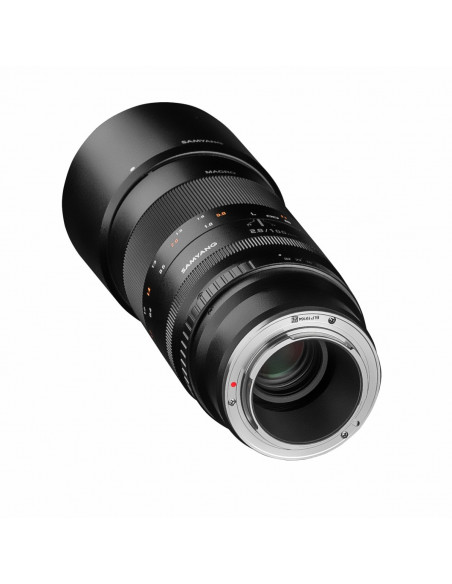 Used on an APS-C camera, it produces an angle of view of 15.4°, which is roughly equivalent to the image impression of a 150 mm lens. The very practical speed of 2.8 does not change. It not only provides an extremely bright viewfinder, but also the possibility of cropping through the smallest depth of field. The lens is very well corrected and convinces with a very high and distortion-free imaging performance. Of course, all lens surfaces are multi-coated to increase the contrast of the images and to avoid reflections if necessary. Everything is rounded off by a precise mechanism, clear click-stop aperture values in a high-quality metal mount. Manual focusing moves comfortably and easily.