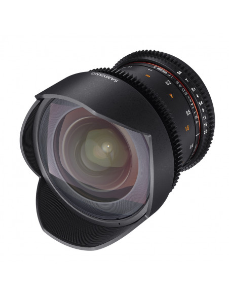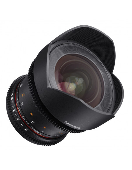 This wide-angle lens from Samyang has been designed to meet the demands of videographers and photographers. The aperture is continuously adjustable from 3.1 to 22, and the focus adjustment is smooth and easy. This allows for smooth tracking of the focus when shooting video. The aperture ring and focus ring are equipped with a toothed ring and are thus optimised for use with follow focus systems. For better legibility, the distance and aperture scales are arranged on the side.
