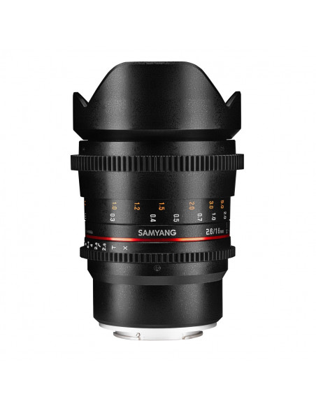 The Samyang VDSLR MF 16mm T2.6 ED AS UMC is a wide-angle cine lens designed for DSLR cameras with a full-frame sensor. It also fits cameras with an APS-C sensor. The 16mm viewing angle, which reflects the well-known image quality of Samyang's wide-angle lenses, is used by photographers around the world for a wide range of emotional scenes in film and video because of its versatility.