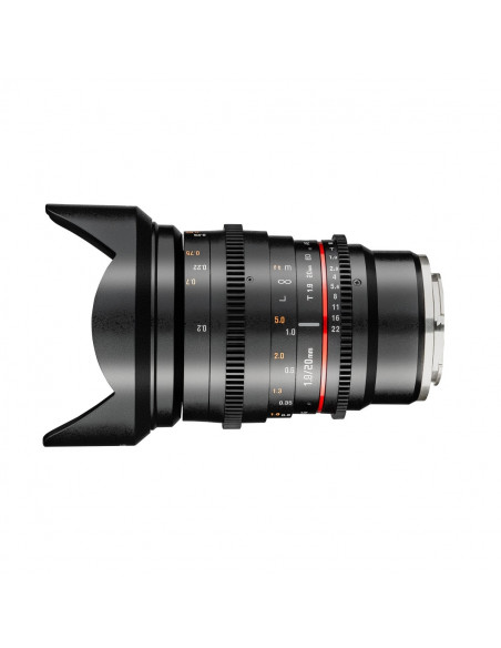 At open aperture, a transmission of T1.9 is achieved. The Samyang 20/1.9 Video DSLR lens is the ideal companion for filmmakers and guarantees good results even in low light conditions. This video DSLR lens has been designed to meet the special requirements of filmmakers and videographers. The subject in focus is skilfully brought into focus, while the background is immersed in a wonderfully soft bokeh at open aperture. This wide-angle cine lens for full-frame sensors is not only suitable for shooting indoors, but also for concerts, landscape and street scenes.