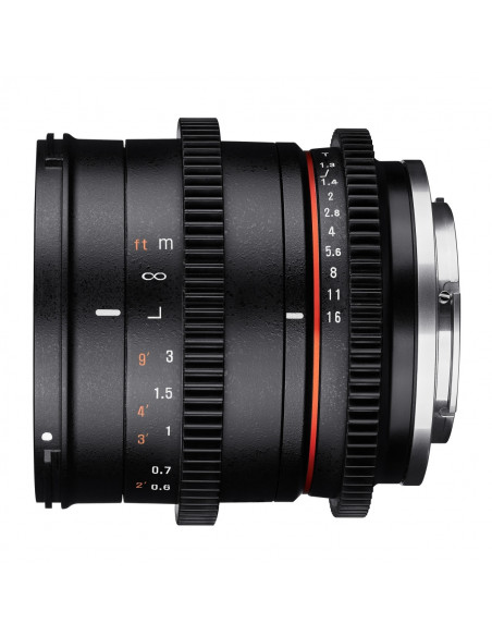This wide-angle lens from Samyang is designed to meet the specific needs of videographers and photographers. The aperture is continuously adjustable from 1.3 to 16 and the focus adjustment is smooth and easy. This allows for smooth tracking of the focus when shooting video. The aperture ring and focus ring are equipped with a toothed ring and are thus optimised for use with follow focus systems. For better legibility, the distance and aperture scales are arranged on the side.