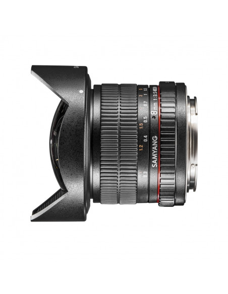 The focal length of only 8 mm allows a close-up limit of 30 cm. Exciting wide-angle images can be captured in brilliant sharpness, starting just before the front lens. The high lens speed of 1:3.5 enables excellent shots even in less favourable light conditions. The lens is optimised for the DSLR camera with APS-C sensor. A lens hood prevents stray light and lens reflections from the side. The glass lenses of the lens are coated and bring an excellent contrast as well as a very good sharpness behaviour. The particularly high-quality optics of the lens ensure optimal image results with balanced colour reproduction.