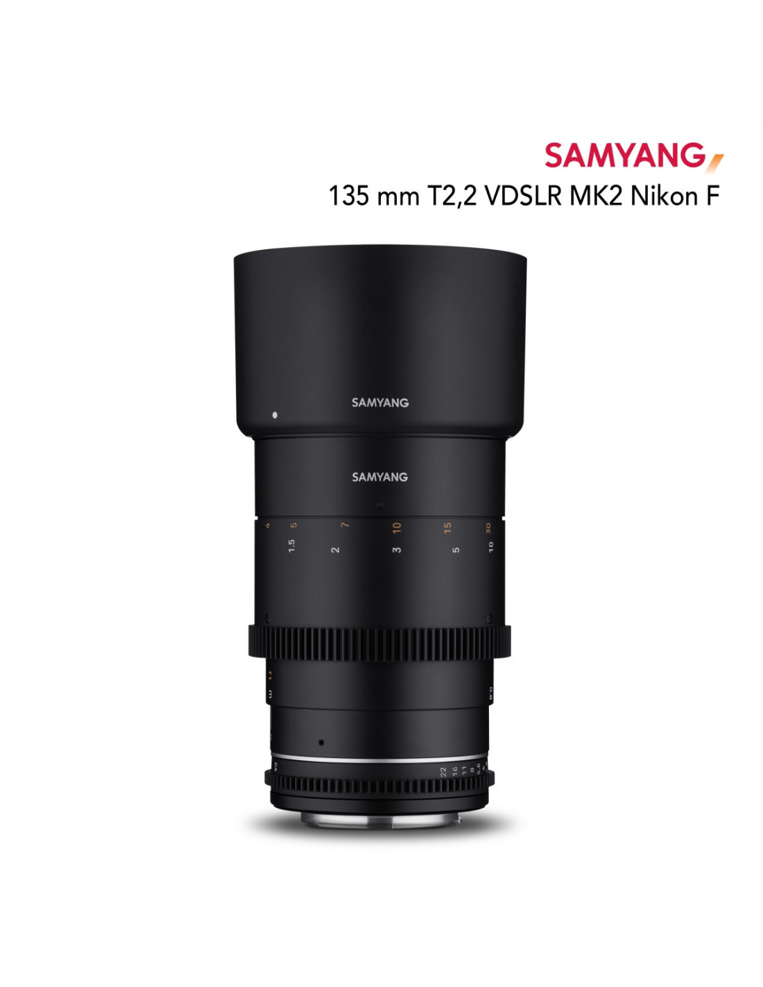 - Scope of delivery: 1x Samyang MF 135mm T2.2 VDSLR MK2 Nikon F, 1x Lens Hood (removable), 2x Protective Caps (front and back), 1x Storage Bag