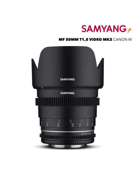 - NEW EDITION OF TRIED TECHNOLOGY – The robust Samyang MF 50mm T1.5 VDSLR MK2 Canon M lens with 50 mm focal length for Canon M mount is ready for any shoot, also on a drone, a gimbal or handheld.