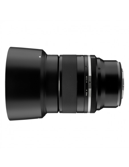 The De-Click function removes the click stops of the aperture steps. The aperture can then be adjusted steplessly, which allows precise, fine adjustment and is also very useful for filming. Simply turn the silver ring of the lens to "Click" or "Free", just as you need it.