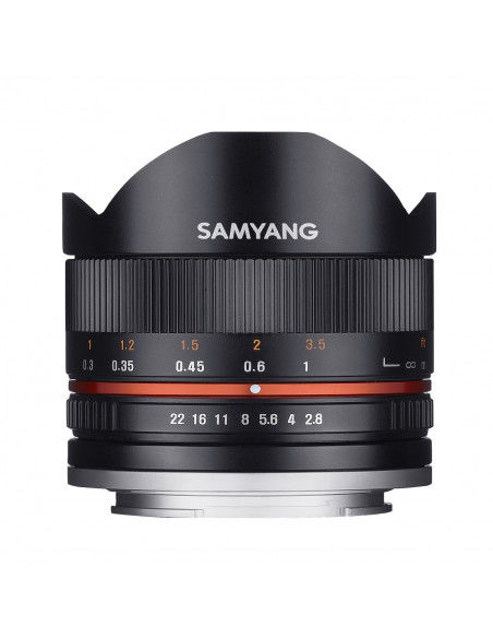 The lens construction of the successor model to the proven Samyang 8/2.8 has been completely revised and optimised. All 11 glass lenses of the lens are multi-coated, resulting in excellent contrast and sharpness rendition as well as a well-balanced colour balance. Thanks to the use of three ED (extra low dispersion) and two aspherical lenses, image errors are almost perfectly corrected. This particularly high-quality optics of the lens ensures optimal image results. The very high speed of 1:2.8 allows for excellent shots even in less favourable light conditions. The lens hood is permanently installed and prevents incident stray light and lens reflections.