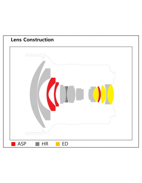The outstanding imaging performance is due to the elaborate optical system. It consists of 11 groups with 18 lenses and sets standards. Particularly noteworthy are the three aspherical lenses, three ED lenses and one HR lens. The aspherical lenses (ASP) minimize imaging errors by reducing unwanted light scattering. The ED (extra-low distortion) lenses prevent chromatic aberrations. The HR (high refractive) lens optimizes the beam path for a clear and luminous image. With these matched high precision aspherical and high refractive lenses, the various possible aberrations are minimized and a clear image is achieved. In particular, this lens has excellent distortion correction and offers excellent resolution from center to edge. The lens hood also prevents interfering lateral light incidence and lens reflections that would lead to loss of contrast.