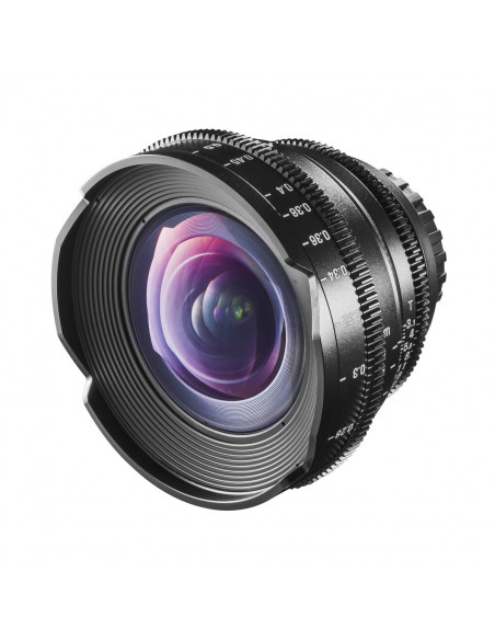 The lens construction of 13 lenses in 12 groups is built into a robust aluminium barrel. The necessary settings on the follow focus or aperture ring are infinitely variable and can be attached to all follow focus systems with a 0.8 mm gear rim. The 9 aperture blades of the 14 mm Cinema lens ensure an almost circular and beautiful bokeh.