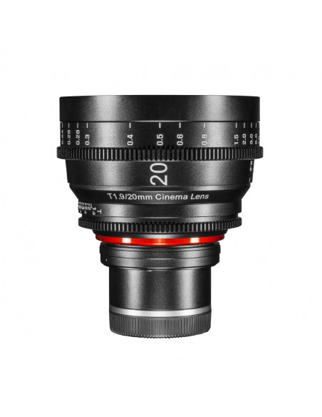 The lens construction of 13 lenses in 12 groups is built into a robust aluminium barrel. The necessary settings on the follow focus or aperture ring are infinitely variable and can be attached to all follow focus systems with a 0.8 mm gear rim. The 7 aperture blades of the 20 mm Cinema lens ensure an almost circular and beautiful bokeh.
