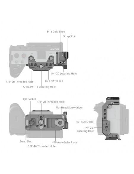 Enhanced performance The SmallRig 4772 HawkLock Quick Release Half Cage for Sony FX3/ FX30 is designed to protect the camera and provide attachment points for accessories. The modular cage consists of a top plate (NATO rail) and an L shaped cage. Highlights Built in HawkLock Quick Release attachment points Modular design with removable NATO rail Arca Swiss quick release plate at the bottom for quick attachment Multiple attachment points NATO rail The NATO rail is secured at the top with two 1/4" 20 screws and removed to install the original XLR top handle. The L shaped cage is secured with a 1/4" 20 screw on the left side and at the bottom to prevent twisting, with a cushion against scratching. Hawlock The patented self developed quick coupling structure (called HawkLock) covers the cold shoe, NATO rail and Arca Swiss plate. It is used in combination with HawkLock eco accessories to slide in smoothly and self lock for more efficient disassembly and assembly. Multiple attachment points The cage is also compatible with traditional cold shoe, NATO Clamp and Arca Swiss Clamp eco accessories. In addition, the cage has built in 1/4" 20 screw holes, ARRI 3/8" 16 locating hole, 1/4" 20 locating holes, QD socket and strap slot, and can be expanded with accessories for professional creations. A magnetic key is also included for easy mounting and dismounting., Dimensions: 102.6 x 75.6 x 44.8mm Weight: 102 g Material: aluminium alloy, stainless steel, silicone 2 year warranty , 1 x SmallRig 4772 HawkLock Quick Release Half Cage for Sony FX3 / FX30 1 x Top plate (NATO rail) 1 x 1/4" 20 screw