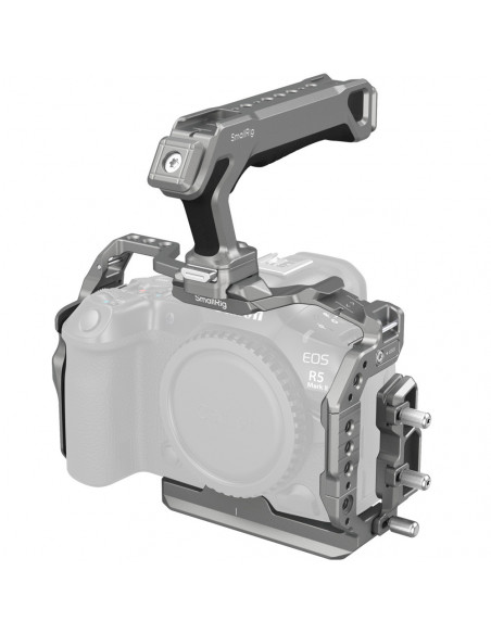 Boost your photography experience SmallRig HawkLock Quick Release Cage Kit for Canon EOS R5 Mark II 5029 is designed to improve handheld shooting stability, portability and accessory expansion. The kit includes a cage, USB C & HDMI cable clamps and the HawkLock quick release lever. Highlights Dedicated handheld kit for smooth operation and convenient portability. Features an ergonomic HawkLock quick release handle Equipped with an HDMI & USB C cable clamp with thumbscrew Various interfaces for versatile shooting scenarios Built in Arca Swiss quick release base plate Multiple interfaces It has HawkLock quick release interfaces for quick and secure mounting. The kit includes the H21 NATO rail with quick release, the H18 cold shoe mount with quick release, the H38 Arca Swiss quick release plate, 1/4â 20 screw holes, 1/4â 20 mounting holes, 3/8â 16 screw holes, ARRI 3/8â 16 mounting holes, cold shoe mounts, NATO rails, QD interfaces, belt slots and more for attaching monitors, microphones, tripods, follow focus systems, grips and other accessories to enhance video content creation in various scenarios. Arca Swiss The cage secures the camera in place with a single 1/4" 20 screw at the bottom and two positioning blocks at the sides, with built in silicone pads to prevent scratching the camera. The built in Arca Swiss quick release plate enables seamless mounting on Arca type tripods (ID 4353, 4060) and DJI RS 2 / RSC 2 / RS 3 / RS 3 Pro / RS 4 / RS 4 Pro stabilisers, allowing quick transitions between stabiliser, handheld and tripod setups. HDMI & USB C cable clamp The ergonomic HawkLock quick release handle with silicone covering ensures a comfortable and stable handheld shooting experience. The HDMI & USB C cable clamp is securely attached with a single thumbscrew, preventing signal interruptions and ensuring stable signal transmission. Scratch resistant In addition, the cage comes with a durable scratch resistant tempered glass screen protector with a surface hardness of 9H and an IK03 shock resistance test., Dimensions: 156.5 x 141.8 x 184.8mm Weight: 406.7g Material: aluminium alloy 2 year warranty , 1 x HawkLock Quick Release Cage 1 x Tempered glass screen protector 1 x USB C & HDMI cable clamp 1 x HawkLock Quick Release Top Handle 1 x User guide