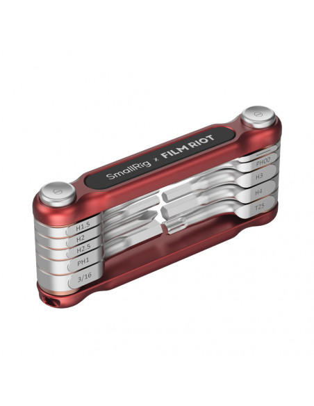 Safe, stable and efficient The SmallRig x FILM RIOT 10 in 1 Detent Folding Multi Tool Kit (Red) 4813 is specially designed for photo and video makers. The 10 in 1 kit has a folding design that ensures portability and convenience, and is suitable for commonly used key sizes in the photo and video industry. Highlights Portable foldable design for convenient storage and transport. The 10 in 1 spanner set includes six Allen spanners (1.5mm, 2mm, 2.5mm, 3mm, 4mm, 3/16), a flathead spanner, two Phillips spanners and a Torx T25 spanner. Metal structure with silicone coating With an exclusive patented structural design, each spanner can be securely positioned at 90° or 180°, making it efficient to assemble and disassemble accessories before and after filming. The set has a non slip silicone coating for a comfortable grip. Made of aluminium alloy and stainless steel, this spanner set guarantees durability and reliability. , Dimensions: 82.0 x 14.0 x 36.0 mm Weight: 120 g Material: Stainless steel, aluminium alloy, copper, silicone 2 year warranty , SmallRig x FILM RIOT 10 in 1 Detent Folding Multi Tool Kit (Red) 4813