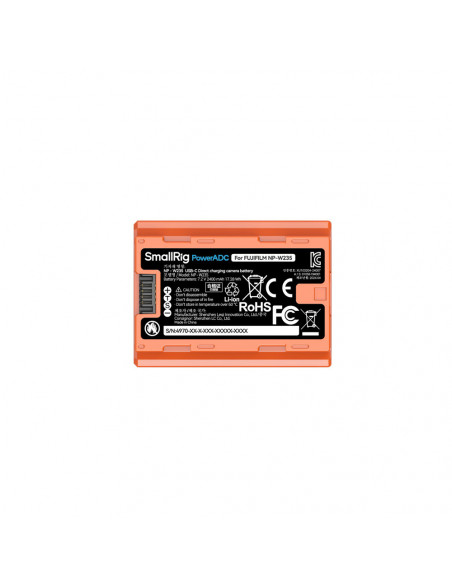 Rechargeable battery The SmallRig 4970 NP W235 USB C Rechargeable Camera Battery (Orange) can be charged via a power bank, power strip, car charger or other dedicated chargers. With high current charging (5V 2.2A) and a rated capacity of 2400mAh, you can fill up the battery in 2.5 hours and use it for a longer time. Highlights USB C charging port supports power bank, power strip, car charger or other dedicated chargers. 2400mAh rated capacity for longer run time. Fully decoded, wide compatibility, no pop ups. Durable and eye catching Fully decoded with no pop ups, this visually striking battery has a matte ABS and PC shell that is fireproof and durable. It has exactly the same dimensions as the original camera battery, so no worries about it getting stuck. The quality battery cell has a safe and reliable circuit for stable voltage and current output., Weight: 104 g Dimensions: 52.3 à 38.8 à 22.7 mm Battery chemistry: Lithium Ion Battery parameters: 2400mAh 7.2V 17.28Wh Input Voltage: 8.4V Rated Voltage: 7.2V Battery Cell Parameters: NCR18500A240A*2/YL Cell Rated Capacity: 2400mAh Battery Nominal Capacity: 2280mAh Input Current: Slow Charging: 0.2C (480mA) Fast Charging: 0.7C (1680mA) Input Current (Max.): 0.7C USB C charging: 5V/2.2A (Max.) Output current (Max.): 5A Over discharge protection: 4.5~7.5A Cut off voltage: 5.0V Operating temperature: 0â~45â Battery weight: 83±5g Material: PC+ABS 2 years warranty , 1 x NP W235 USB C rechargeable camera battery 1 x Battery cover 1 x 0.6 m USB A to USB C charging cable 1 x User guide