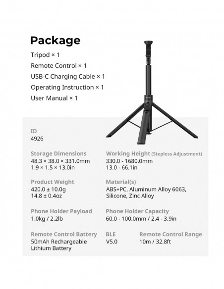 4926 ST30 One Touch Deploy Selfie Stick Tripod (Black)