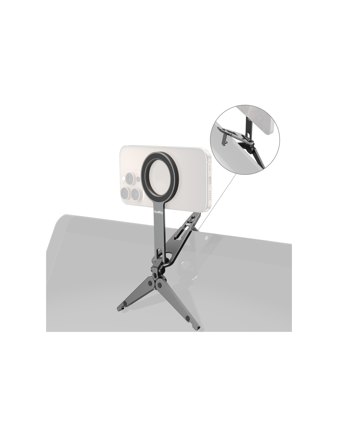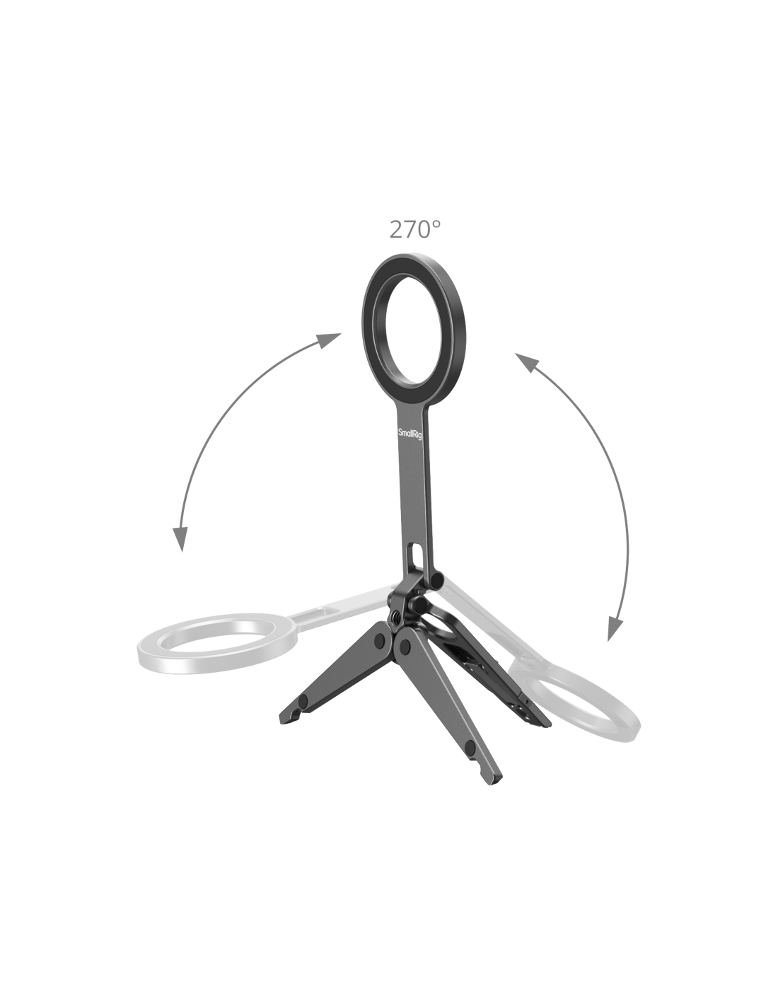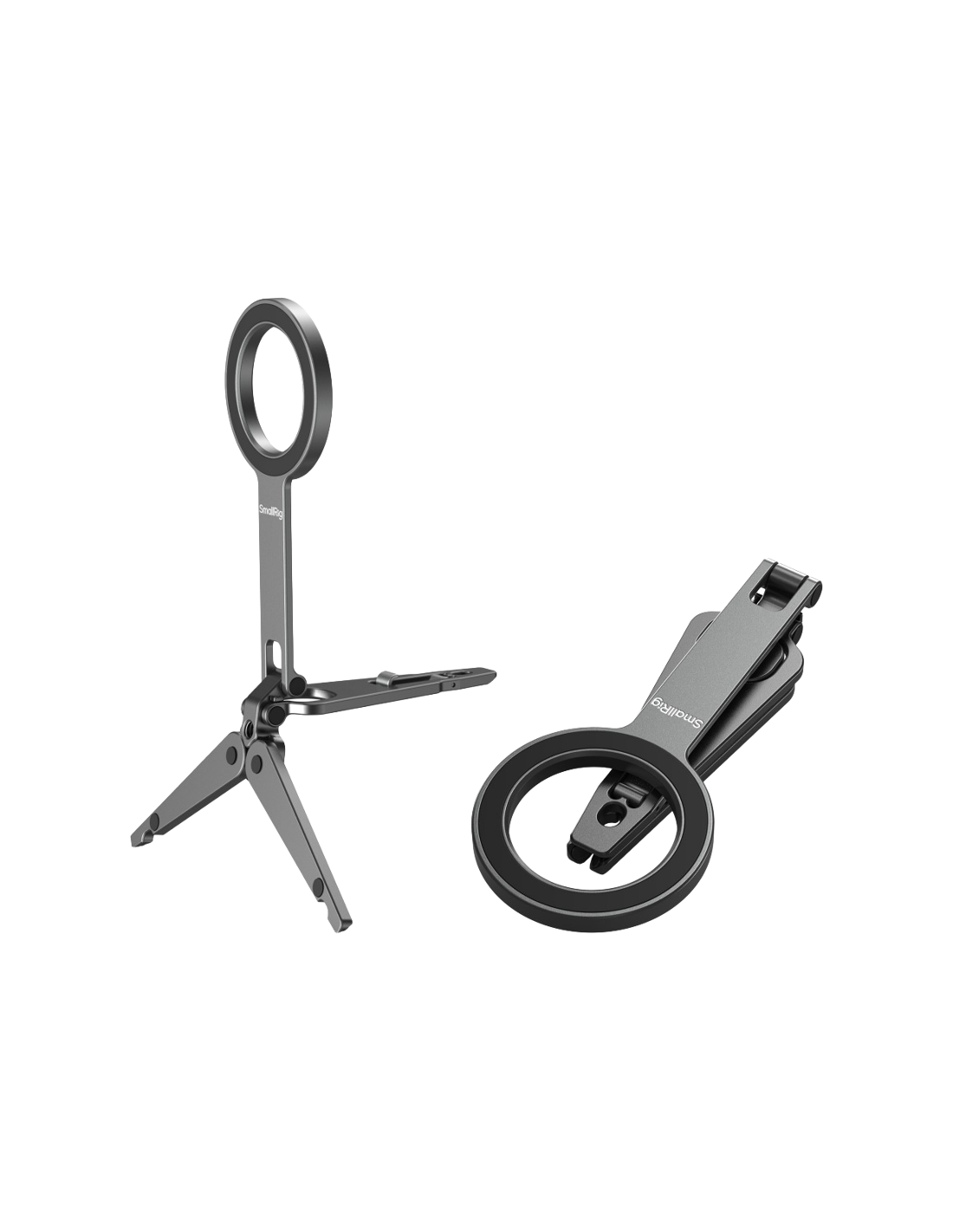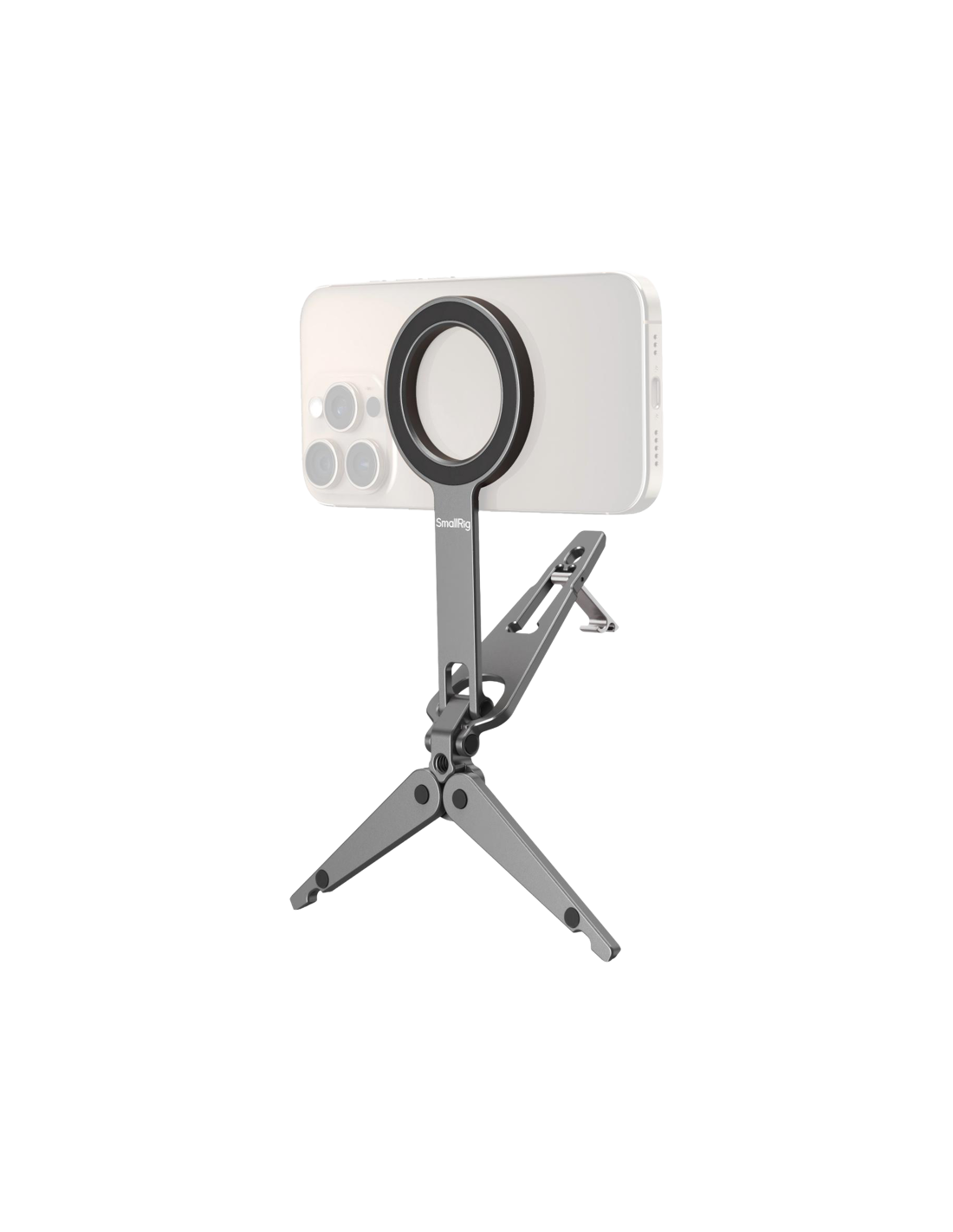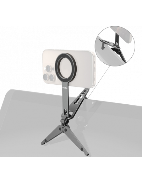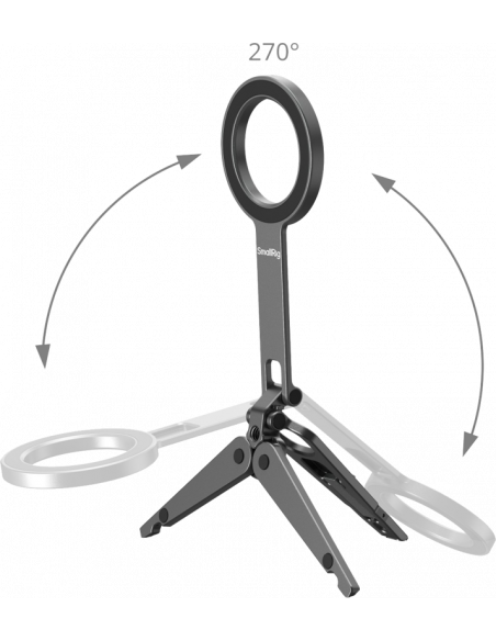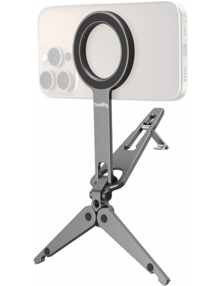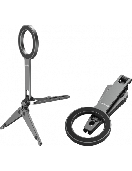 SmallRig 5649 Mobile Phone SupportKompatibel med MagSafe-aktiverede iPhone 12-17-modeller, den inkluderer også en magnetisk ringadapter til ikke-MagSafe-enheder. Stativfoden har skridsikre silikonepuder til stabil placering, og det integrerede krogbeslag gør det muligt at montere sikkert på overflader som computerskærme (op til 4 mm tykke) eller trådnethegn langs banen til stabil optagelse. Det foldbare design sikrer en kompakt form, når det opbevares, hvilket gør det let og meget bærbart.Note:Max belastningskapacitet: 300gMax understøttende højde (lodret): 16cmHook Max Compatible Thickness: 4mm Undgå at sætte den fast på kreditkort, pas, høreapparater osv. da det kan afmagnetisere dem. Hold dem adskilt.Pakken indeholder:TelefonsupportMetalring.