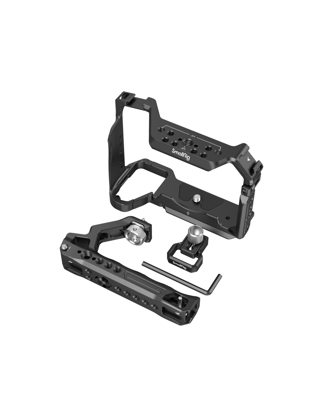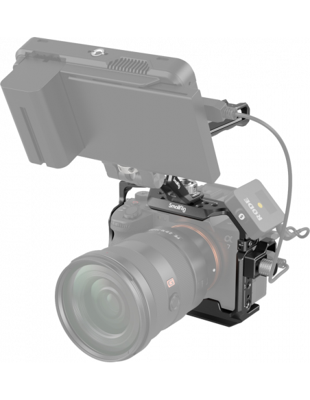 SmallRig 3668 Basic Kit til Sony A7R V / A7 IV / A7S IIIDet øverste håndtag føles behageligt og gør det nemt at bære og optage fra en lav vinkel.1/4"-20-gevindhuller, ARRI 3/8"-16-lokaliseringshuller, kolde sko og NATO-skinner understøtter SmallRig-monitormontering 2294, mikrofoner, LED-lys, monitormontering 2903 og NATO-tilbehør.HDMI-kabelklemmen, der er monteret på venstre side af buret via en 1/4"-20-skrue og to lokaliseringsstifter, forhindrer afbøjning og fastgør kabler med en tommelfingerskrue for at beskytte grænseflader og sikre stabil signaloverførsel.Desuden er der huller på begge sider af buret til fastgørelse af håndstropper.Buret leveres med en indbygget magnetisk fladhovedskruetrækker og sekskantnøgle for nem afmontering og montering.Bemærkning:For at bruge burets sidelås skal du først fjerne splitringen på kameraets venstre side.Kompatibilitet:Sony Alpha 7R VSony Alpha7 IVSony Alpha7S IIIPakken indeholder:1 x bur1 x HDMI-kabelklemme 30001 x ARRI-lokaliseringshåndtag 21651 x sekskantnøgle
