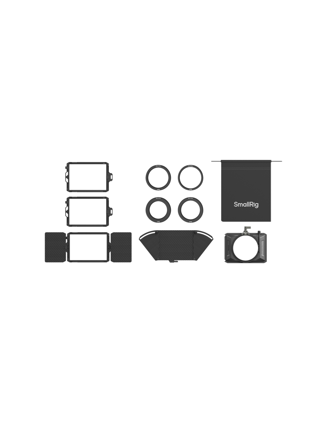 SmallRig 3680 Mini Matte Box ProTopflaget åbner op til 180°, mens sidevingerne strækker sig op til 40° for at give et større blokeringsområde.   Sideflaget kan fastgøres til enten matkassen eller filterbakken ved hjælp af en NATO-klemme og åbner også op til 180° for at blokere strølys.Pakken indeholder fire adapterringe (Φ67-95mm, Φ72-95mm, Φ77-95mm, Φ82-95mm), der giver mulighed for direkte montering på biografobjektiver med en ydre diameter på 95 mm eller montering på filtre til spejlløse kameraer (kompatible med filterstørrelserne Φ67mm, Φ72mm, Φ77mm og Φ82mm). Der medfølger også en bæretaske til nem opbevaring af matboksen og filterbakkerne.Bemærk: Topflaget kan ikke lukkes helt, når der bruges dobbelte filterbakker eller en filterbakke med sideflag.Kompatibilitet:Cinema-objektiver med en ydre diameter på 95 mm (inkompatibel med spejlløse objektiver med 95 mm gevind)Spejlløse objektiver (filterstørrelser: Φ67, 72, 77, 82 mm)Cirkulære filtre (maksimal ydre diameter: <Φ92,5 mm)Cirkulære filtre (maksimal ydre diameter: <Φ92,5 mm)4 mm tykke 4 x 5,65" firkantede filtrePakken indeholder:1 x Mini Matte Box Pro1 x sideflag1 x topflag1 x Φ67/72/77/82-95mm-adapterring2 x Filterbakke (4x5,65")1 x Opbevaringstaske