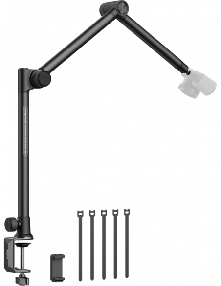 SmallRig 4324 Desk Overhead Photography / Live Streaming Bracket.Den 3-delte bomarm er forbundet med hydrauliske dæmpningsled, der giver mulighed for ophængt positionering på et hvilket som helst tidspunkt, hvilket sikrer udstyrets sikkerhed ved at forhindre pludselig løsrivelse og samtidig muliggør præcis justering af optagelsesvinkler.Det integrerede anti-deflektionskuglehoved med en 1/4"-20-skrue sikrer fleksible justeringer og bred kompatibilitet med kameraer, actionkameraer, telefoner, webkameraer og andre enheder til optagelse i flere vinkler.Den nederste klemme kan gribe sikkert fat i bordplader, der er op til 7 cm tykke, og passer til de fleste bordstørrelser.Pakken indeholder også 10 kabelbindere til at organisere udstyrskabler og sikre et rent og pænt skrivebord.Pakken indeholder:1x Overhead 3-sektion Boom Arm Desk Mount10x kabelbinder1x telefonklemme1x kuglehoved