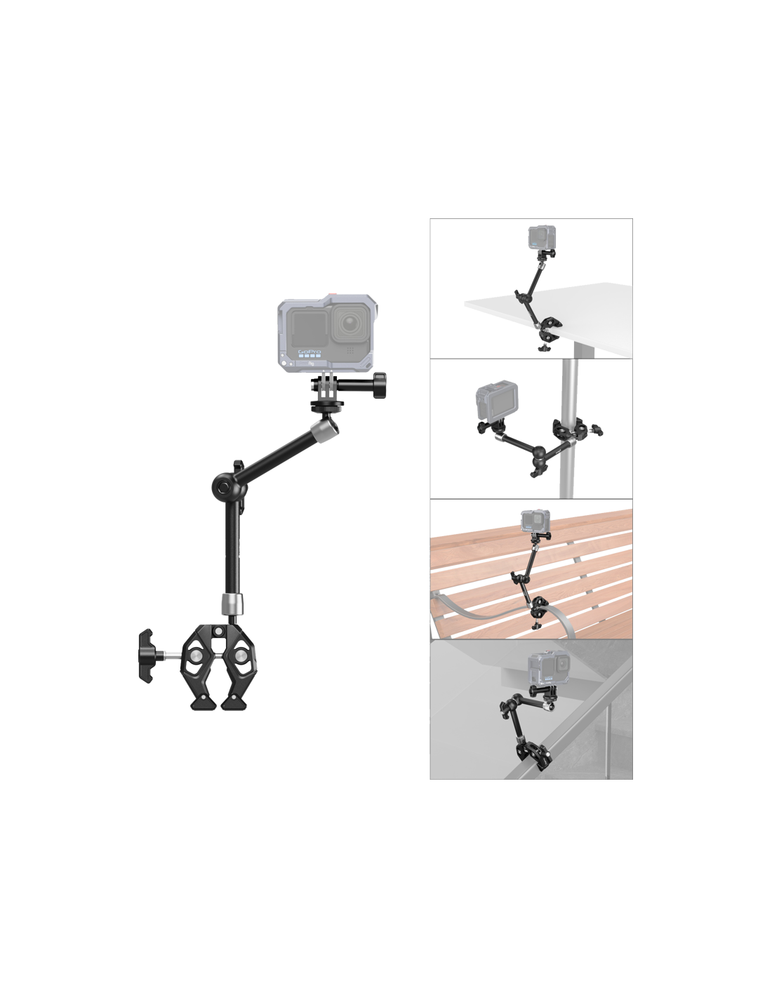 SmallRig 4454 Krabbeformet superklemmesæt med magisk arm.Samlingen af den magiske arm og krabbeklemmen har et anti-twist-design for at sikre stabilitet og forhindre, at den løsner sig og falder af under bevægelse.Klemmens drejelige spidsdesign forbedrer kompatibiliteten med både flade og afrundede overflader ved at justere drejningen af klemmens spidser for at sikre udstyrets stabilitet.Klemmen kan fastgøres til overflader med en bredde på op til 50 mm og har indbyggede gummipuder, der forhindrer ridser og øger klemmestabiliteten.Actionkamera-holderen gør det muligt at fastgøre SmallRig: Cage for GoPro 3084 / 3083, Frame for Insta360 X3 4088 og Cage for DJI Osmo Action 4/3 4119.Bemærk:Bæreevne: 1,5 kgPakken indeholder:1x krabbeformet klemme1x magisk arm1x Action Camera Mount