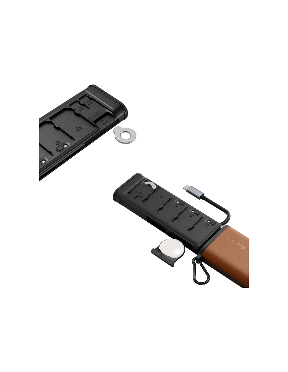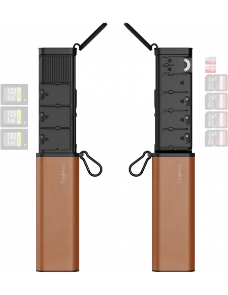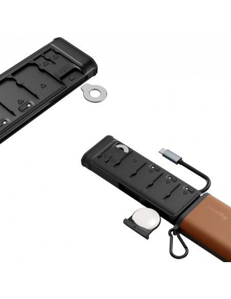 SmallRig 4532 Multifunctional Card Reader & Storage Case CFexpress Type B Udstyret med en indbygget USB 3.2 Gen 2-chip leverer den hastigheder på op til 10 Gbps (1250 MB/s), mens kølepladen i aluminium og den ekstra USB-C-strømforsyningsport sikrer stabil ydeevne. Den dedikerede AirTag-slot giver mulighed for mere sikker håndtering af hukommelseskort.Etuiet kan opbevare op til 9 kort: 4x SD, 2x Micro SD (TF) og 3x CFexpress Type B. Hver plads har en silikonepude til sikker opbevaring og en drejetast til at markere kortstatus (tom/fuld). Dertil kommer en karabinhage til forbedret bærbarhed og en flad skruenøgle til nødafmontering.Kompatibilitet:USB: 3.2 Gen2 (10Gbps / 1250MB/s), bagudkompatibel med 3.1 / 3.0 / 2.0SD-kort: UHS-II (SD / SDXC / SDHC, op til 312 MB/s), UHS-I-kompatibelMicro SD: UHS-II (Micro SD / SDXC / SDHC, op til 312 MB/s), UHS-I-kompatibelPakken indeholder:Multifunktionel kortlæserKarabinhageFlatnøgle