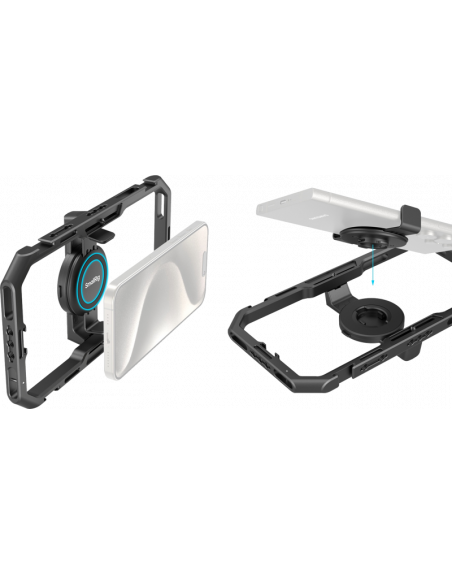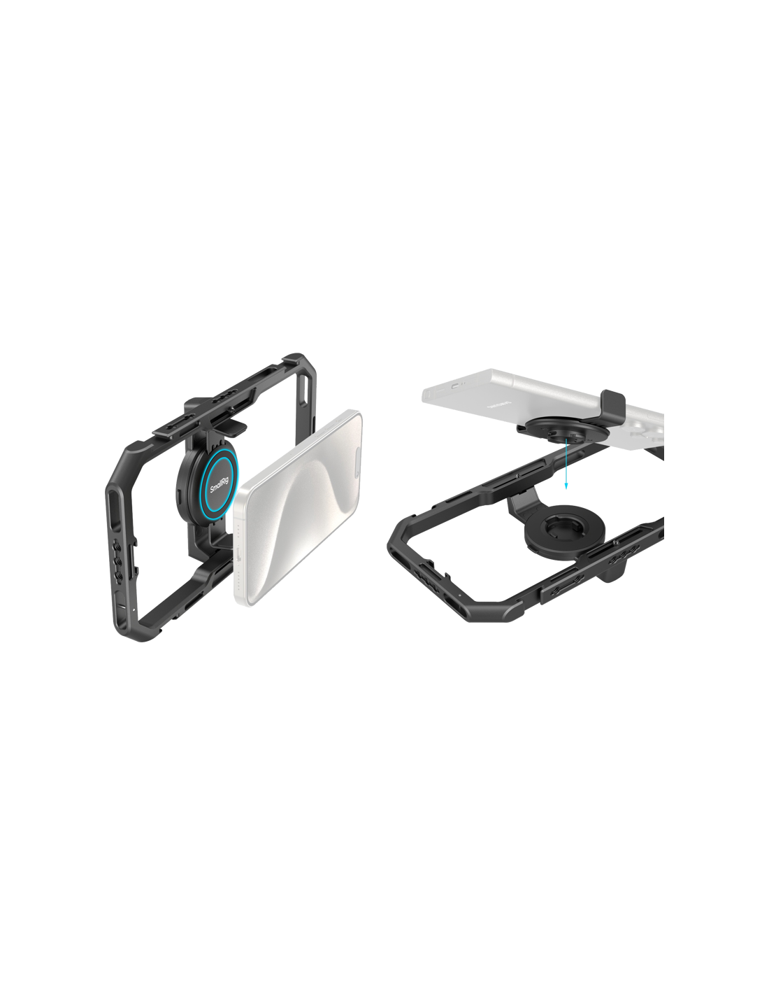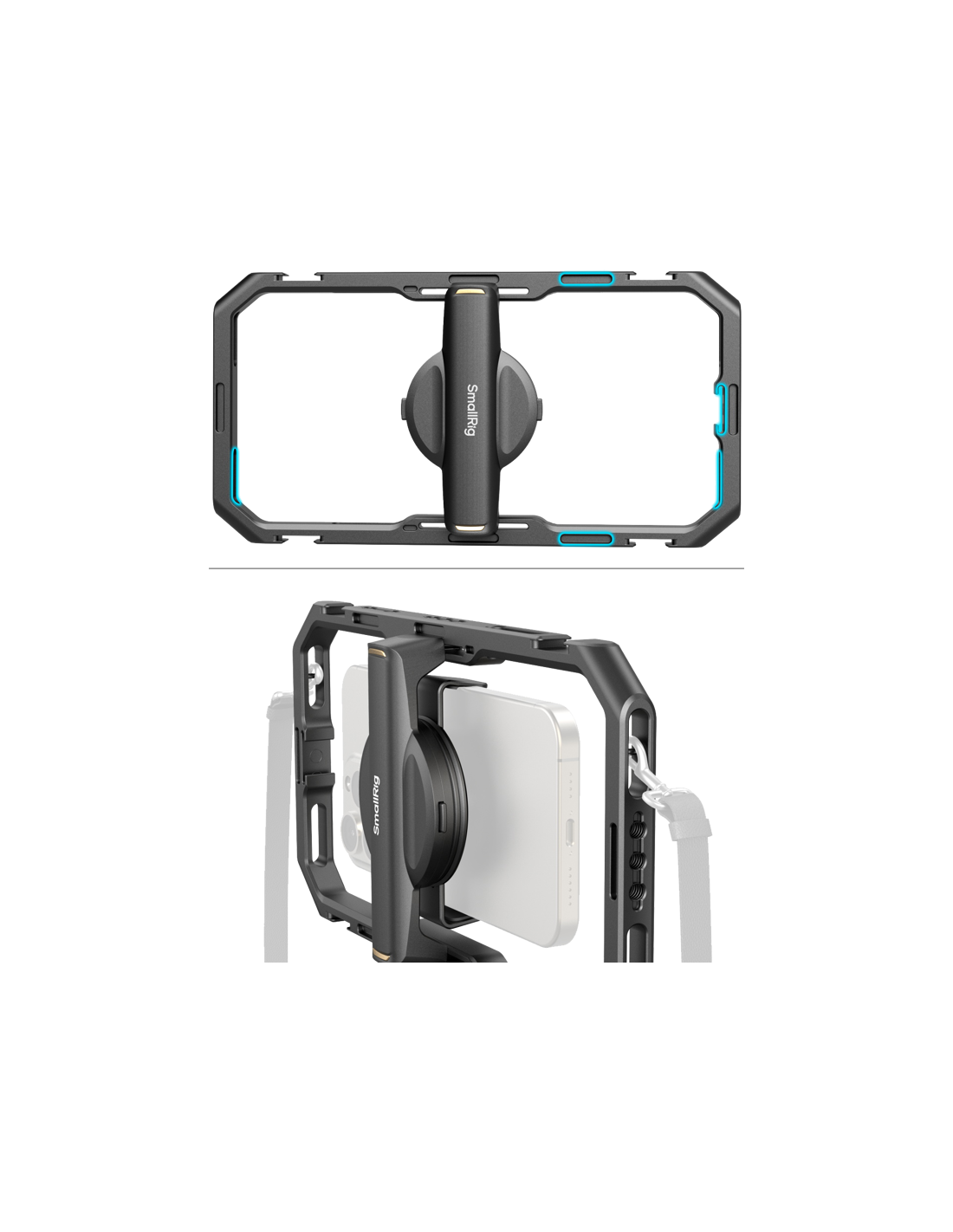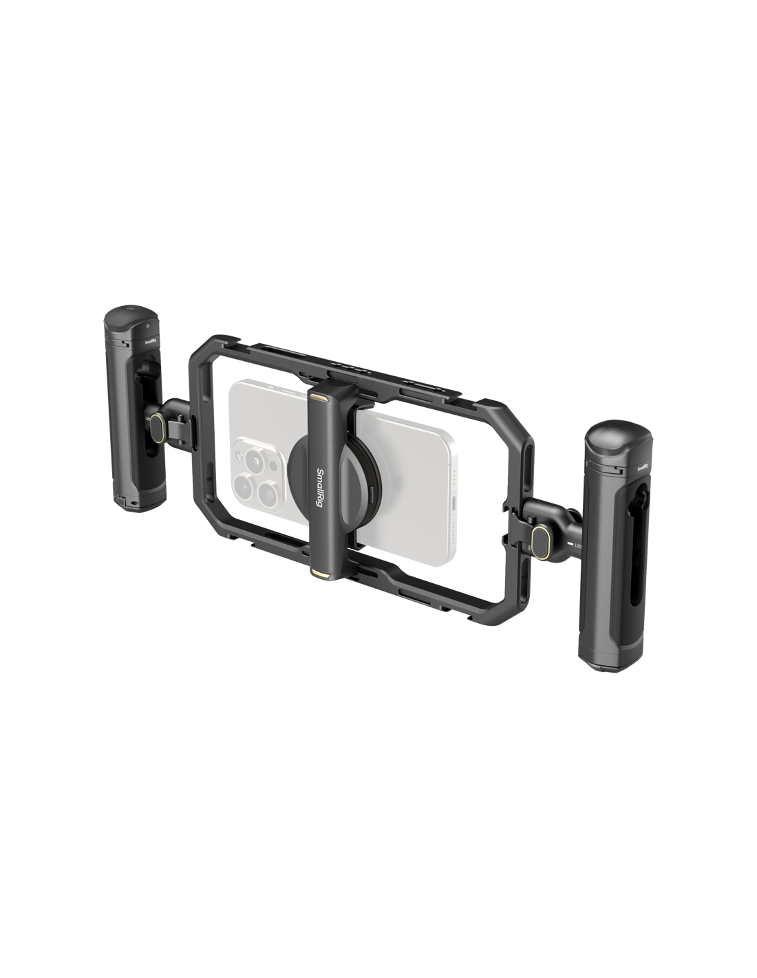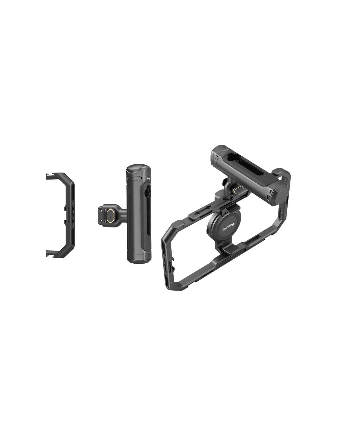 SmallRig 4597 All-in-One Video Kit for Smartphone Creators Quick Basic Edition.Det opgraderede universalbur har flere huller med 1/4"-20-gevind og cold shoe-montering, hvilket giver mulighed for at udvide med en lang række professionelt videoudstyr.Desuden giver det mulighed for at fastgøre 67 mm magnetiske filtre og har et hul til skulderrem og en dock-monteringsåbning.Buret kan låse telefonen sikkert fast ved hjælp af enten en magnetisk MagSafe-fastgørelse eller en telefonclips.Quick release-sidehåndtaget understøtter hurtig fastgørelse og kan fungere som både side- og tophåndtag ved hjælp af forskellige monteringsmetoder.Den aftagelige trådløse controller giver mulighed for fjernudløsning og -optagelse med en maksimal fjernbetjeningsafstand på op til 10 m.Kompatibilitet:Buret er kompatibelt med smartphones med en bredde på 64 - 88 mm og kan bruges sammen med etuiernePakken indeholder:1x Universal Quick Release-bur til smartphone1x Quick Release-håndtag med trådløs kontrol1x sidehåndtag med hurtig frigørelse1x betjeningsvejledning