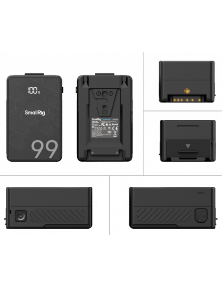 SmallRig 4608 V-Mount Battery Mini VB99 SE.Batteriet er udstyret med en BP-, en D-Tap-, en 8V-OUT DC-, en 12V-OUT DC-, en USB-C- og en USB-A-porte, der giver en bred vifte af grænseflader til strømforsyning af flere enheder samtidigt.Dette omfatter kameraer, spejlløse kameraer, skærme, sendere, videolamper, smartphones, tablets, bærbare computere og meget mere, hvilket giver en integreret og effektiv strømforsyning til alle dine behov.Batteriet har en stærkt integreret hurtigopladningsprotokolchip, MCU, boost/buck-kontrolchip og batteristyringssystem (BMS), der giver flere beskyttelser, herunder overstrøm, kortslutning, overtemperatur og overspænding.Derudover understøtter den forskellige hurtigopladningsprotokoller som PD, QC og PPS og muliggør 65W USB-C dobbeltrettet PD-hurtigopladning.Batteriets ydre er lavet af brandsikkert pc-materiale, der er varmebestandigt og flammehæmmende, hvilket sikrer holdbarheden.Det har en OLED-skærm, der tydeligt viser batteriniveau, resterende brugstid, spænding, strøm og andre oplysninger, så du kan overvåge batteriets status nøjagtigt.Den er designet til at opfylde internationale standarder som MSDS / UN38.3 / IEC 62133 / UL2054 / UL 62368 og har opnået certificeringer som FCC / CE / RoHS / ISED / RCM / PSE / KC, hvilket sikrer sikker og pålidelig drift for brugerne.Kapacitet - 14,54V 6,8Ah 99WhNominel effekt - afladning: 100W Opladning: 65WV-montering / D-TAP-indgang - 6,8 A (maks.)V Mount / D-TAP Output - 14,8V / 10A (maks.)USB-A-udgang 5V=3A, 9V=3A, 12V=2,5A (maks.)USB-C Input/Output - Max Input 65W / Output: 5V=3A, 9V=3A, 12V=3A, 15V=3A, 20V=3,25A (maks.)DC1-udgang - 8V / Max3ADC2-udgang - 12V / Max3AValgfri opladningsmetode - 16,8V D-TAP-oplader, USB-C-oplader som GaN-oplader med PD-hurtigopladningsteknologi (op til 65W)Emballagen indeholder:1x VB99 SE mini V Mount-batteri1x brugervejledning