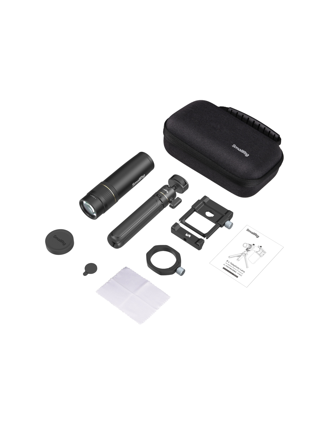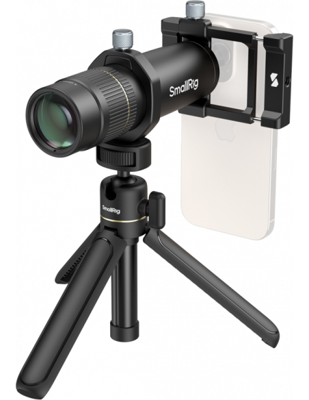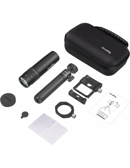 SmallRig 4737 8x teleobjektiv til mobiltelefon (T-fatning)Med multi-coated optisk glas sikrer objektivet pålidelig optisk ydeevne, minimerer forvrængning og viser levende billeder i høj opløsning. Objektivet, objektivklemmen og stativet er konstrueret af en robust aluminiumslegering og garanterer holdbarhed og reducerer sløring af billedet ved bevægelse af stativet.T-fatningen giver mulighed for hurtig og effektiv installation, mens objektivklemmen fastgøres sikkert til smartphones med en enkelt berøringsmekanisme.Den justerbare position og låseknappen på klemmen sikrer præcis justering med objektivet, så man undgår vignettering og forbedrer brugeroplevelsen.Objektivklemmen og objektivadapteren er kompatible med iPhone 12/13/14/15/16-serien og har 1/4"-20-gevindhuller til montering på større stativer, hvilket giver alsidig brug.Bemærk:Det anbefales at bruge et stativ for at forhindre sløring af billedet forårsaget af rystelser.Pakken indeholder:1x 8x telefotolinse1x objektivklemme til mobiltelefon1x skrivebordsstativ1x adapter til stativmontering2x silikone objektivhætter (objektivhætte + okularhætte)1x opbevaringstaske1x rengøringsklud1x betjeningsvejledning