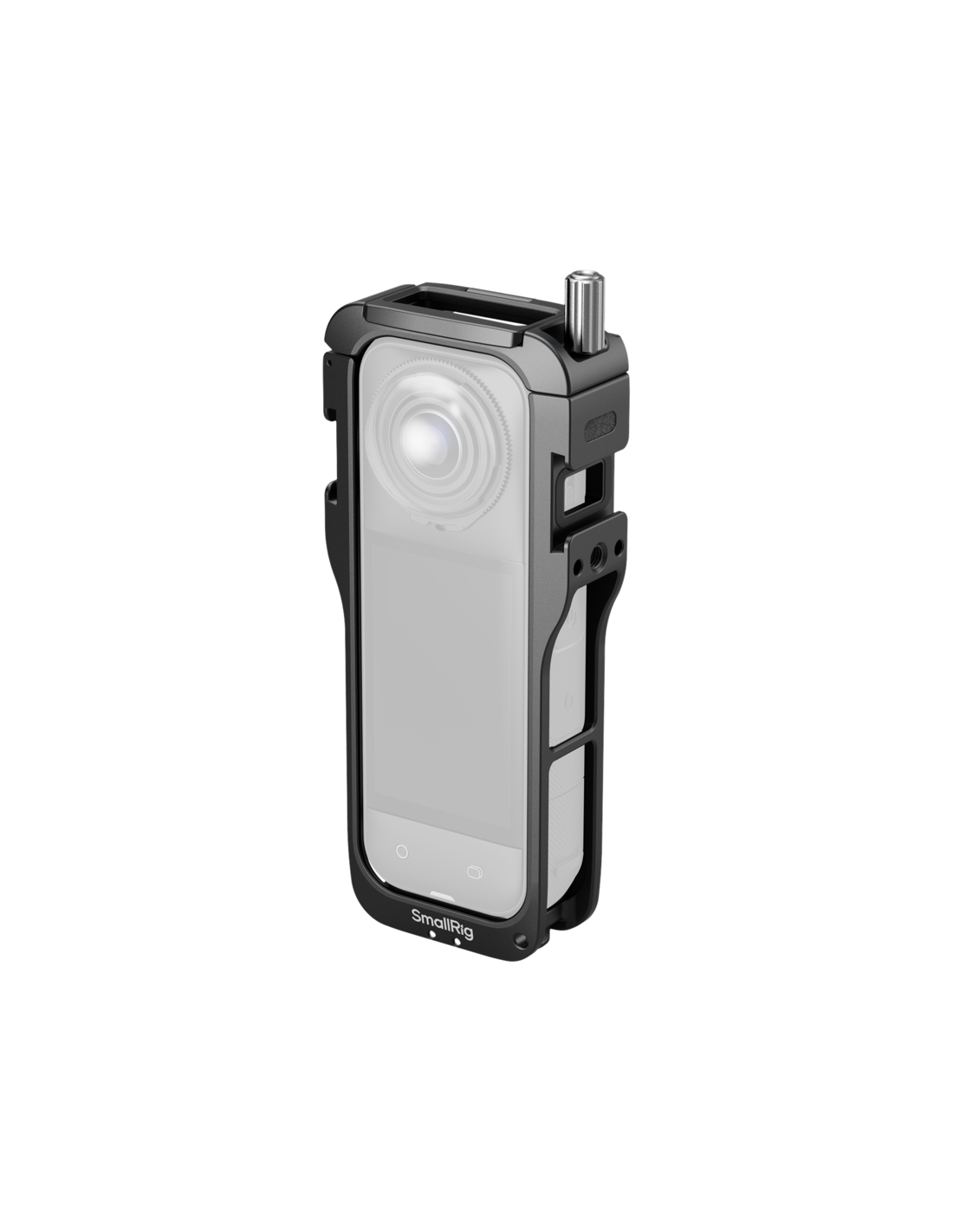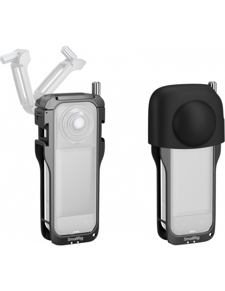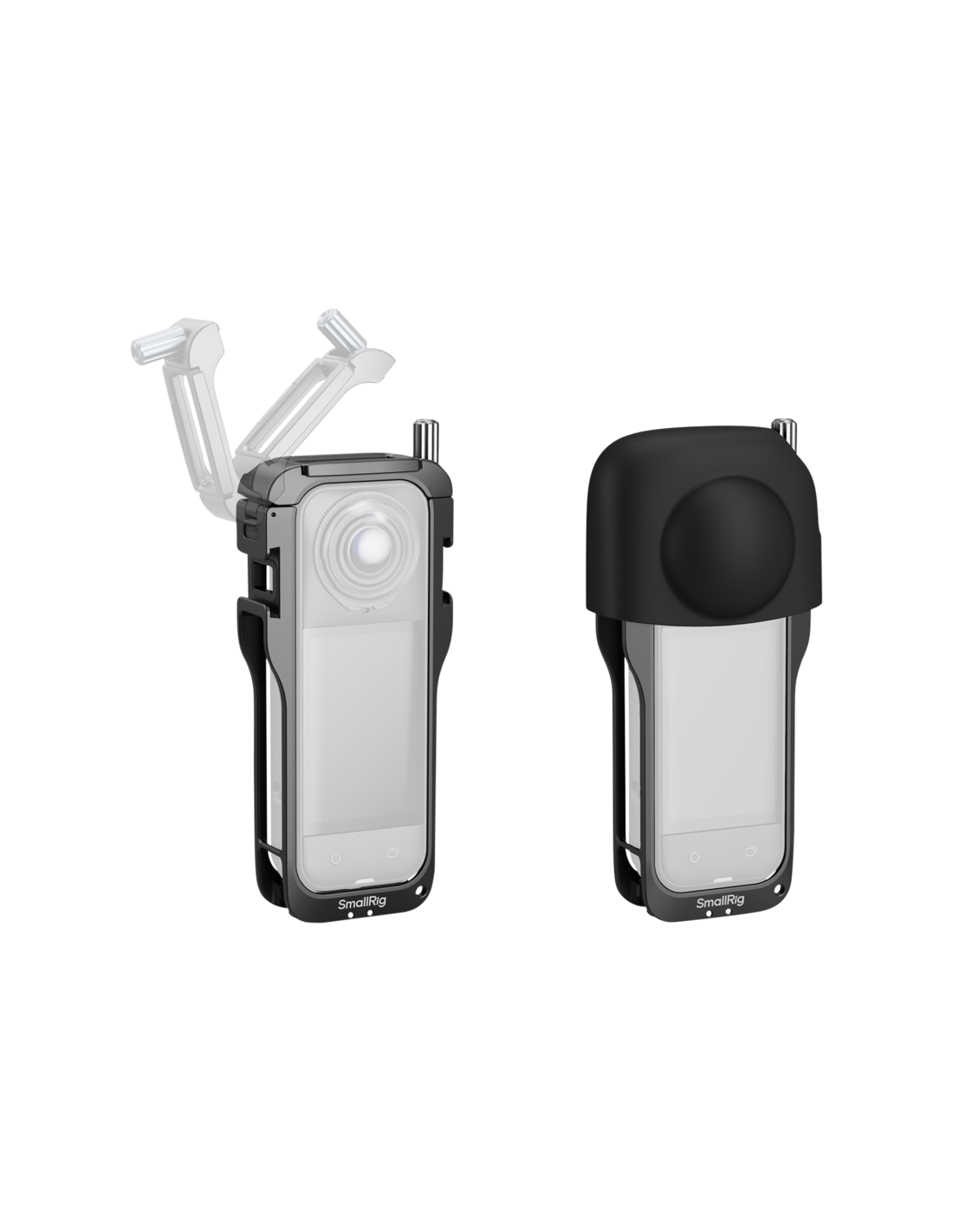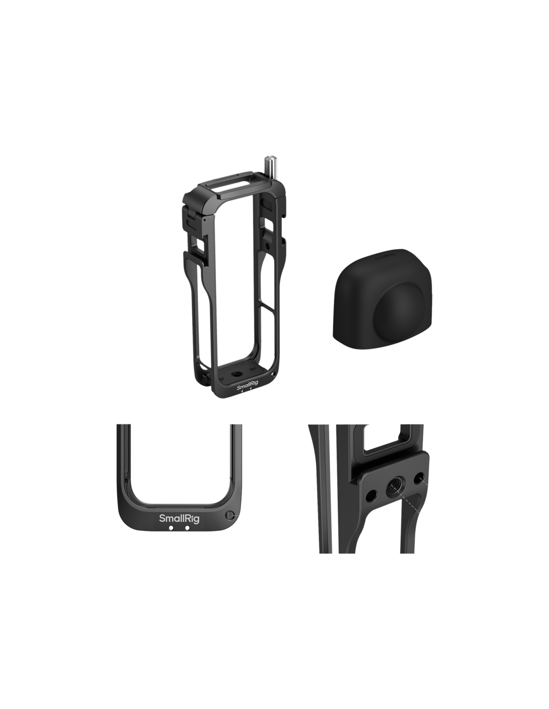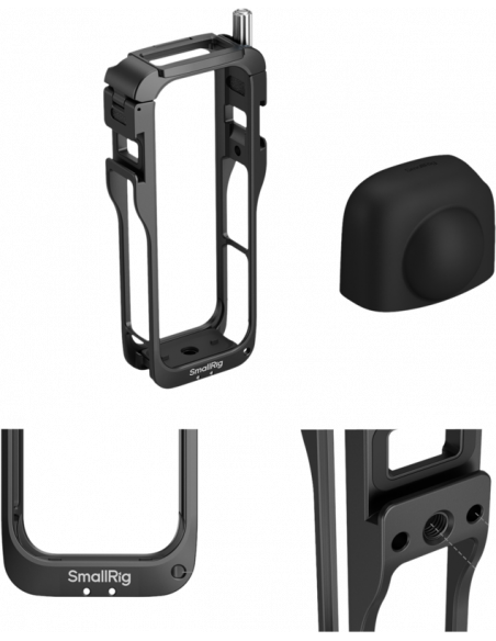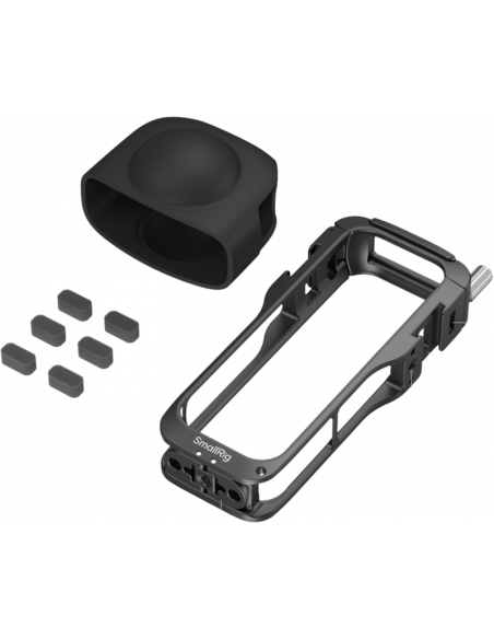 SmallRig 5195 Cage for Insta360 X5  Buret er konstrueret til effektivitet og har ubesværet adgang til batteriet gennem præcise sideudskæringer - ingen adskillelse er påkrævet.   Det tætsiddende design tilpasser sig kameraets konturer med indvendig silikonepolstring for at forhindre slid på kroppen.   Installation er ubesværet - skub blot kameraet ind fra toppen og fastgør det med den medfølgende fingerskrue.Til tilbehør har den ene side et koldt skobeslag og et 1/4"-20 anti-twist gevindhul til montering af mikrofoner eller lys.  Ud over et sammenklappeligt actionkamerahold på basen er der også et 1/4"-20-gevindhul til fastgørelse af stativer eller selfiesticks.  Buret indeholder desuden et silikoneobjektivdæksel (kun til brug sammen med buret), som beskytter objektivet mod ridser under opbevaring.  Kompatibilitet:Insta360 X5Pakken indeholder:BurSilikoneobjektivdæksel6x støjreducerende forrude-skum