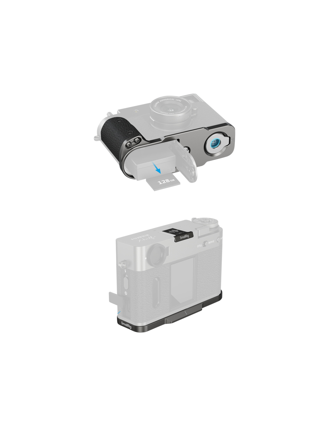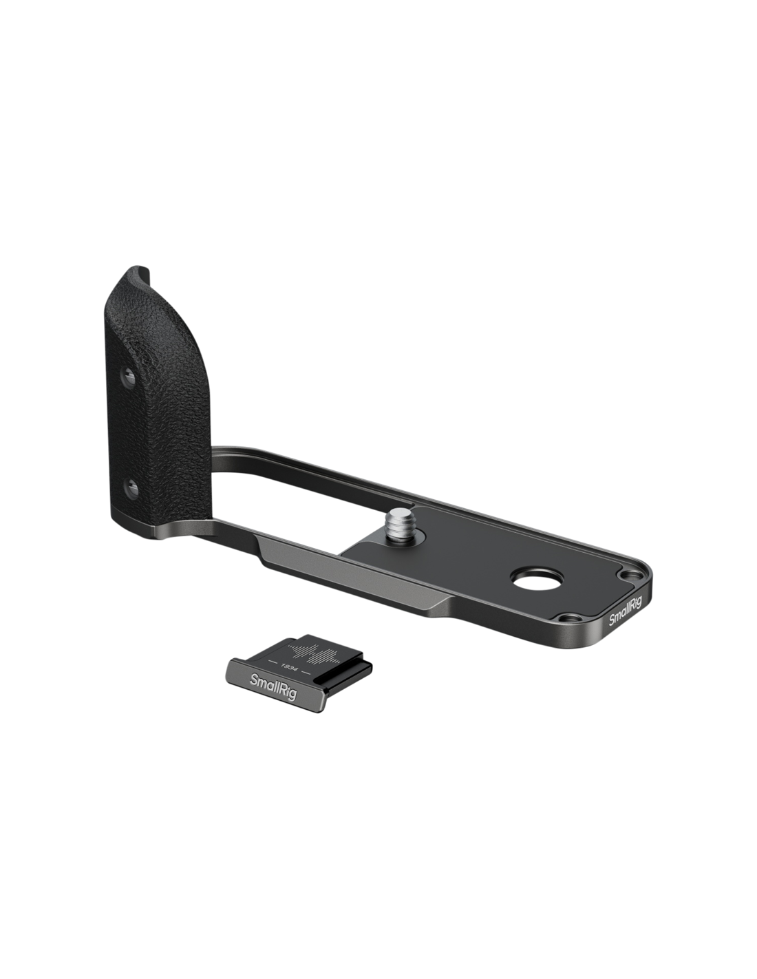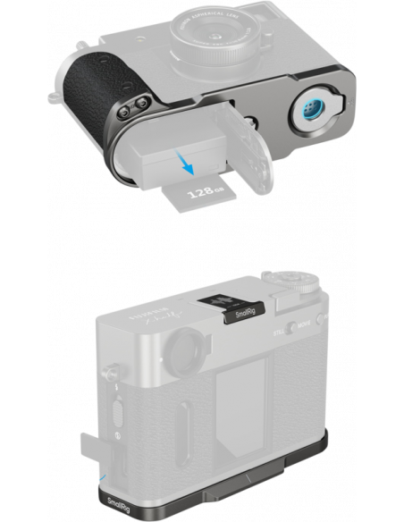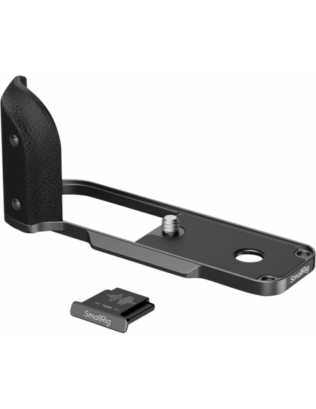 SmallRig 5217 L-formet monteringsplade med silikonehåndtag til FUJIFILM X half Charcoal Silver Den fastgøres sikkert til kameraet ved hjælp af en 1/4"-20-skrue i bunden med integrerede silikonepuder på både håndtaget og monteringsfladen for at beskytte mod ridser.  Basen har en Arca-Swiss quick release-plade til øjeblikkelig montering på stativer af Arca-typen, mens en indbygget fladnøgle gør det nemt at montere og afmontere.Det L-formede greb giver fuld adgang til alle kameraets grænseflader, herunder batterirummet, fokusringen, hukommelseskortåbningen og højttalerportene.   Der medfølger et jubilæumscover til hot shoe med FUJIFILMs karakteristiske soundwave-gravering og mærkets grundlæggelsesår "1934", hvilket skaber en nostalgisk forbindelse for FUJIFILM-entusiaster.Kompatibilitet:FUJIFILM X halfPakken indeholder:L-formet grebHot Shoe Cover.