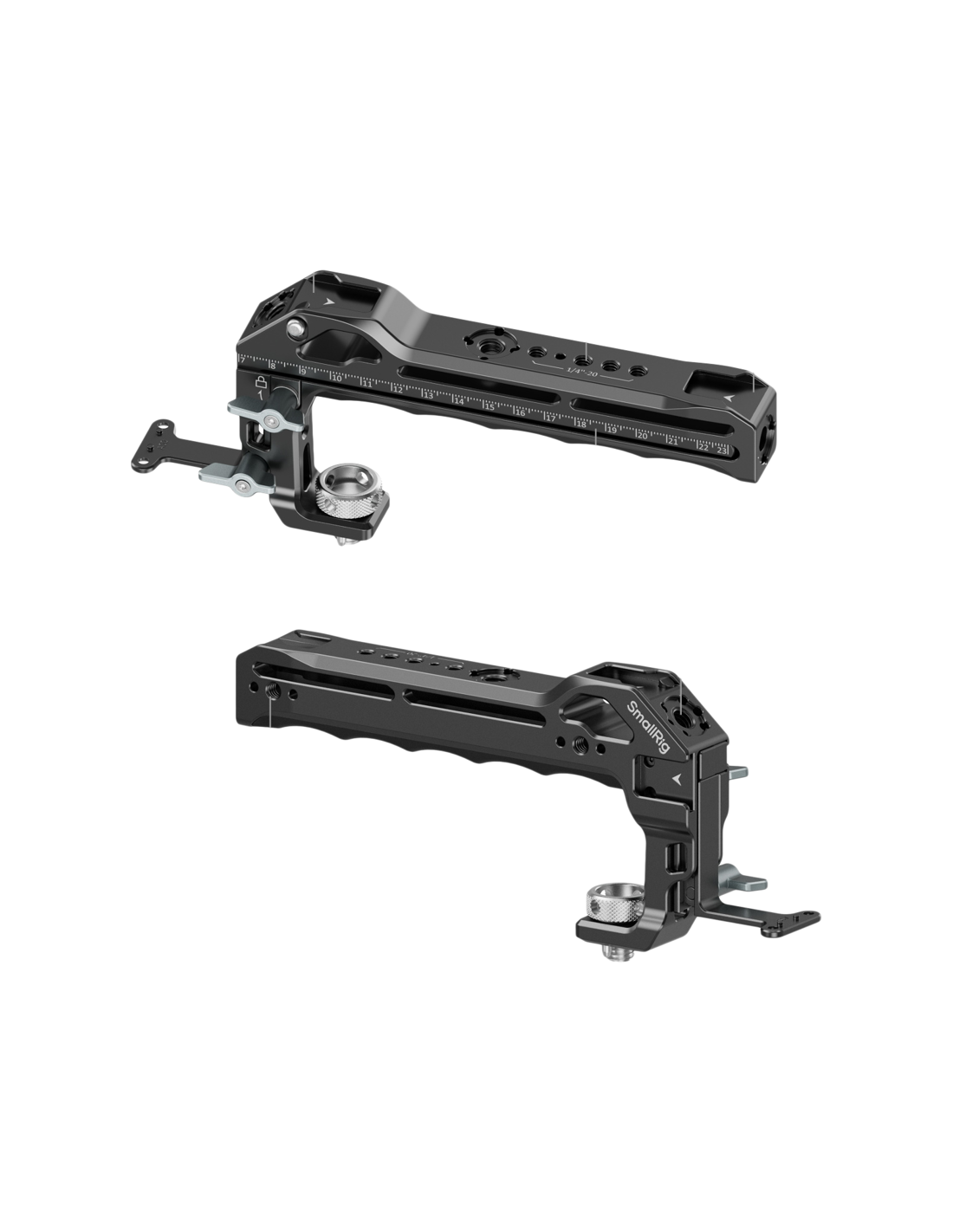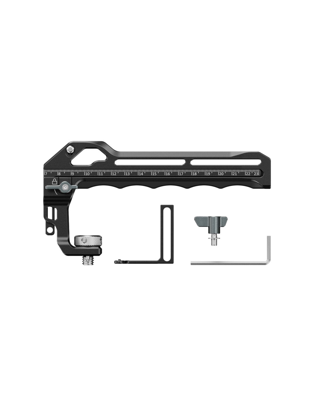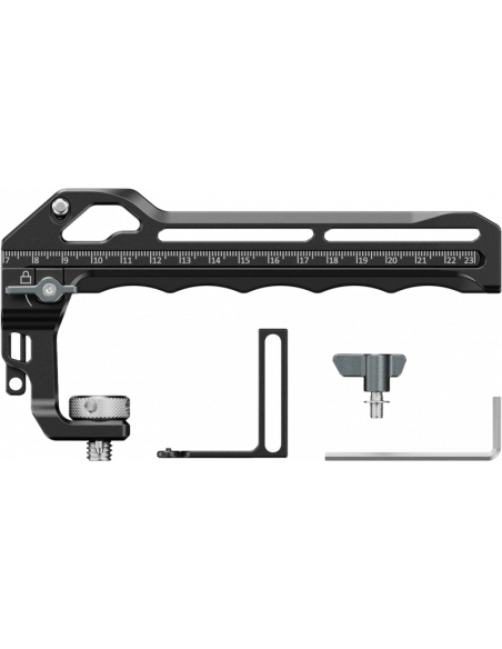 SmallRig 5236 Top Handle for DJI Focus Pro LiDAREn indbygget 23 cm måleskala giver direkte afstandsmålinger mellem LiDAR-glasplanet og kameraets fokalplan, hvilket effektiviserer kalibreringen. Det aftagelige beslagdesign giver fleksible konfigurationer til forskellige optagemiljøer. Når håndtaget ikke er i brug med DJI Focus Pro-systemet, fungerer det som et konventionelt tophåndtag, hvilket øger alsidigheden og omkostningseffektiviteten.Håndtaget er ergonomisk designet og har et behageligt greb med indbygget silikone, der er skridsikkert og kuldebestandigt. Det er udstyret med to koldskosamlinger på forsiden og to på bagsiden til samtidig fastgørelse af tilbehør som mikrofoner, videolys eller skærme. Front- og toplokaliseringshuller fra ARRI gør det muligt at fastgøre monitorbeslag til udvidelse af monitorer, mens flere 1/4"-20-gevindhuller og lokaliseringshuller på toppen og højre side er kompatible med magiske arme til monitormontering eller fjernbetjeninger til kontrol af kameraoptagelser.Kompatibilitet:Kompatibel med alle bure med ARRI-lokaliseringshuller på toppenPakken indeholder:TophåndtagLåseknapVaskemaskineAllen-nøgleMonteringsbeslag til DJI Focus Pro LiDARBedriftsinstruktion
