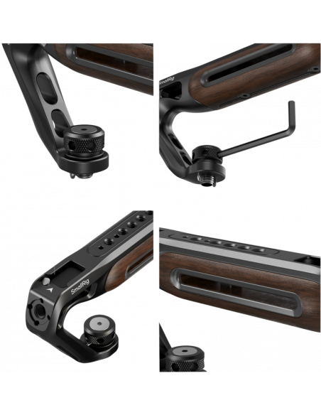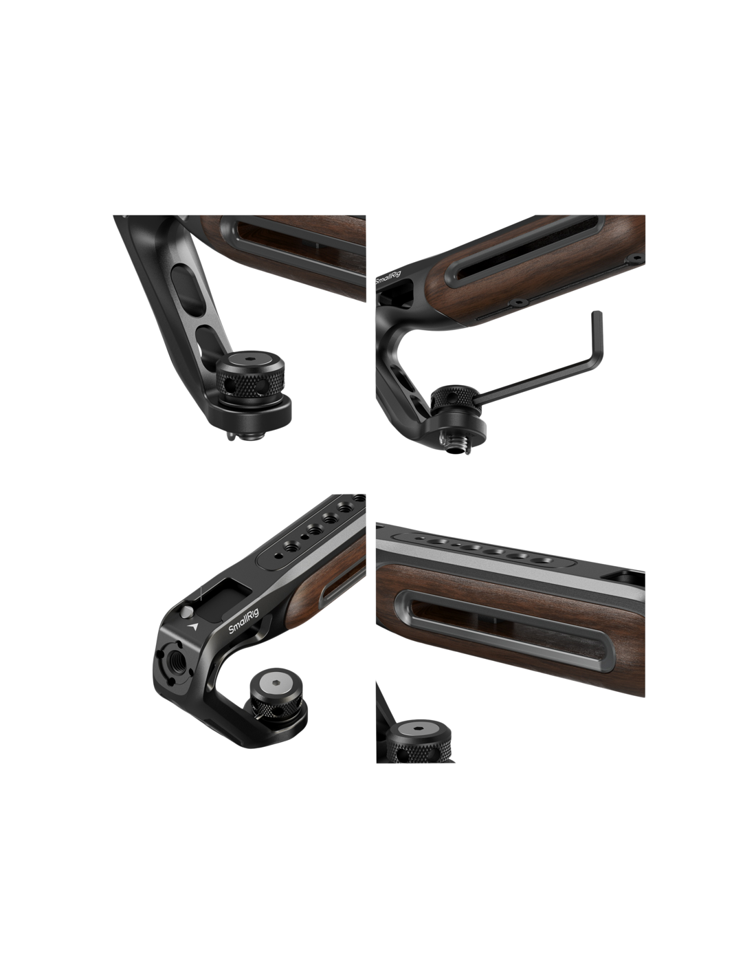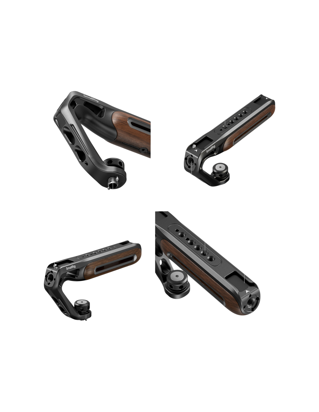 SmallRig 5252 Tophåndtag i træ med 1/4''-20 og ARRI 3/8''-16-placeringsskrueHåndtaget er fremstillet af førsteklasses træ udvendigt og en integreret kerne af aluminiumslegering, som giver enestående holdbarhed og stabilitet.Det aflange greb, der måler 165 mm, sikrer komfortabel håndtering for brugere med større hænder, samtidig med at det bevarer en slank, kapselinspireret form.Med en robust belastningskapacitet på 15 kg leverer dette håndtag både pålidelig ydeevne og stilfuld æstetik.Det tilbyder alsidige udvidelsesmuligheder gennem flere monteringsgrænseflader:3/8"-16 ARRI-lokaliseringshuller til monitorarme, 1/4"-20 gevindhuller og lokaliseringshuller til tilbehør som fjernbetjeninger og magiske arme, sammen med en kold skomontering, der er kompatibel med monitorbeslag, mikrofoner, videolys og DJI Mic 2.Kompatibilitet:Bure eller monteringsplader med 1/4"-20-lokaliseringshuller eller 3/8''-16 ARRI-lokaliseringshuller på toppenPakken indeholder:TophåndtagAllen-nøgle