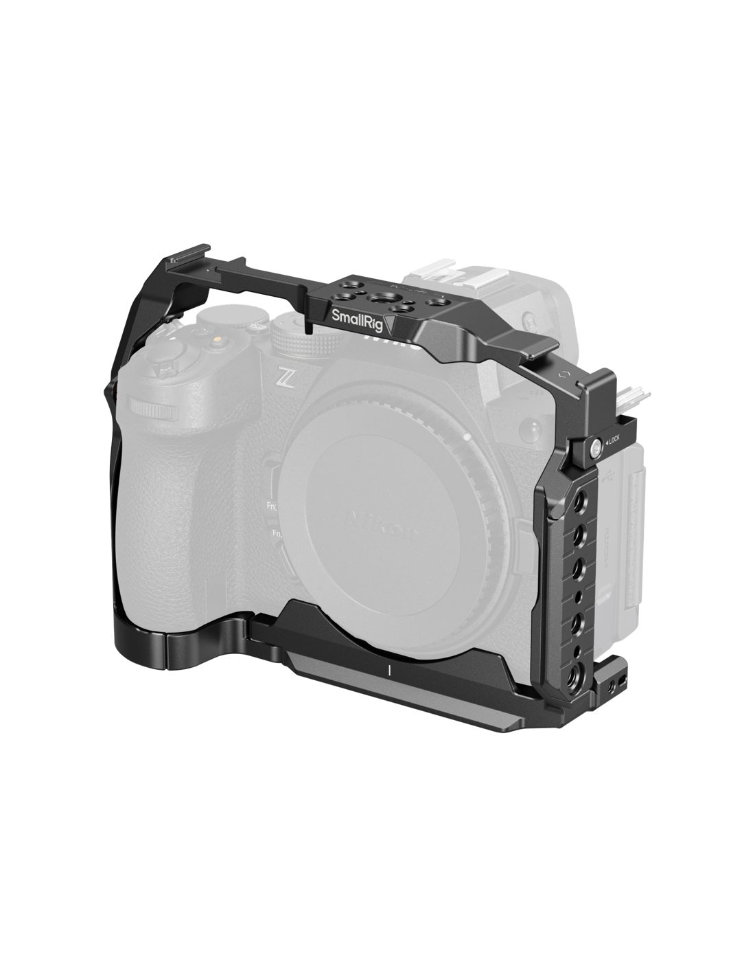 SmallRig 5257 Cage for Nikon Z5II  Buret har et trepunktslåsesystem, der bruger en 1/4"-20-skrue i bunden og to placeringsblokke i siden til at fastgøre kameraet og forhindre afbøjning, mens indbyggede puder beskytter det mod ridser.   Det er vigtigt, at buret ikke forstyrrer kameraets knapper, porte, flipskærm eller batterirum.Det er udstyret med 1/4"-20-gevindhuller, 1/4"-20-placeringshuller og 3/8"-16-gevindhuller til fastgørelse af tilbehør som f.eks. sidehåndtag og tophåndtag til jævn kamerabevægelse samt monitorbeslag, stativer, powerbankholdere og mini V-mount-batteriplader.   Siden har et 1/4"-20-placeringshul til montering af enkeltstangsklemmer, magiske arme og sidehåndtag.Venstre side af buret har en HawkLock NATO-hurtigudløserskinne, der gør det muligt at fastgøre sidehåndtag til hurtig montering og afmontering af tilbehør.   Det har også et koldskofæste til mikrofoner og lys, en stropåbning til håndledsremme og et QD-stik til skulderremme.   Det har også åbninger til skulderremme, der er designet til at bære kameraet med objektivet nedad for at forhindre skader.Bunden har en Arca-Swiss quick release-plade til direkte montering på stativer af Arca-typen og DJI RS 2 / RSC 2 / RS 3 / RS 3 Pro / RS 4 / RS 4 Pro / RS 4 Mini gimbals, hvilket muliggør hurtige overgange mellem stabilisator, håndholdt og stativopsætning.  For strømløsninger kan den parres med V-mount-batteriplader og V-mount-batterier for længere optagelsestid.  Den indbyggede dobbelte hovednøgle i bunden gør det nemt at montere og afmontere.  Kompatibilitet:Nikon Z5II, Z7, Z6, Z7II, Z6II, Z5Pakningen indeholder:BurBrugervejledning