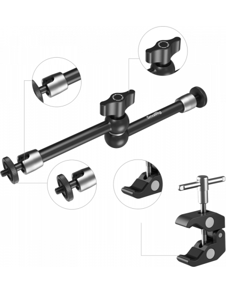 SmallRig 5326 Krabbeformet klemme til telefoner 9,8"Leddet mellem den magiske arm og superklemmen har et anti-bøjningsdesign for at sikre stabilitet og forhindre, at den løsner sig under bevægelse.Klemmens kæber er beklædt med beskyttende puder for at forhindre ridser og forbedre stabiliteten.Actionkamerafæstet gør det muligt at fastgøre SmallRig-bure til GoPro, bure til Insta360 X4 og bure til DJI Action 5 Pro.Bemærkning:Belastningskapacitet: 1,5 kgPakken indeholder:SuperklemmeMagisk armAction Camera Mount