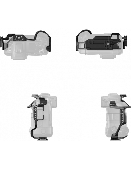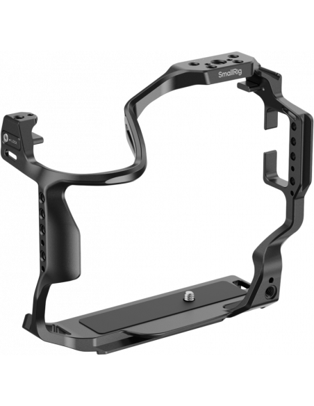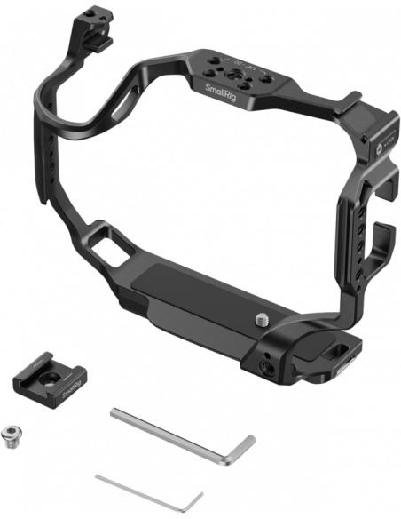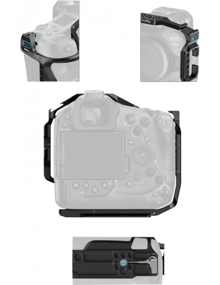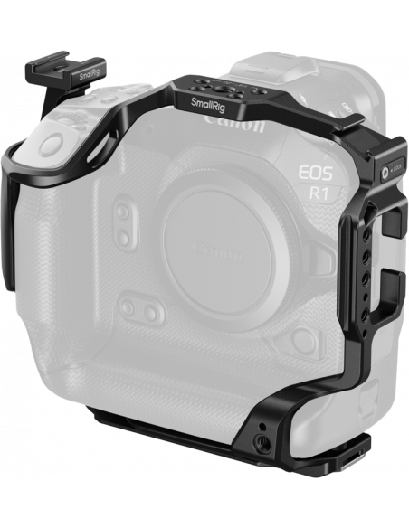 SmallRig 5413 Cage for Canon EOS R1Buret har et trepunktslåsesystem, der bruger en 1/4"-20-skrue i bunden og to placeringsblokke i siden til at fastgøre kameraet og forhindre afbøjning, mens indbyggede silikonepuder beskytter kameraet mod ridser.Både bunden og venstre side har indbyggede Arca-Swiss quick release-plader, der sikrer kompatibilitet med stativer af Arca-typen Bundpladen kan monteres direkte på DJI RS 2 / RSC 2 / RS 3 / RS 3 Pro / RS 4 / RS 4 Pro gimbals, så der hurtigt kan skiftes mellem liggende og stående retning til hurtige sceneovergange.Pakken indeholder en aftagelig cold shoe-montering, der muliggør vandret cold shoe-montering i begge optagelsesretninger. Buret har også flere udvidelsesgrænseflader, herunder 1/4"-20-gevindhuller, 1/4"-20 & 3/8"-16 ARRI-lokaliseringshuller, cold shoe-monteringer, remspor og QD-sokler. Disse grænseflader understøtter forskelligt tilbehør som f.eks. håndtag, skulderremme og håndledsremme.Kompatibilitet:Canon EOS R1Pakken indeholder:BurAftageligt koldskofæste2x unbrakonøgle1/4"-20-skrue