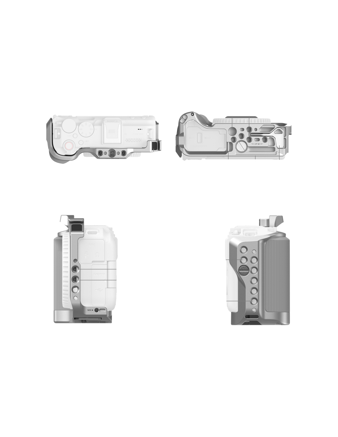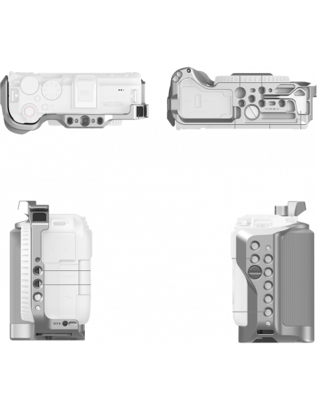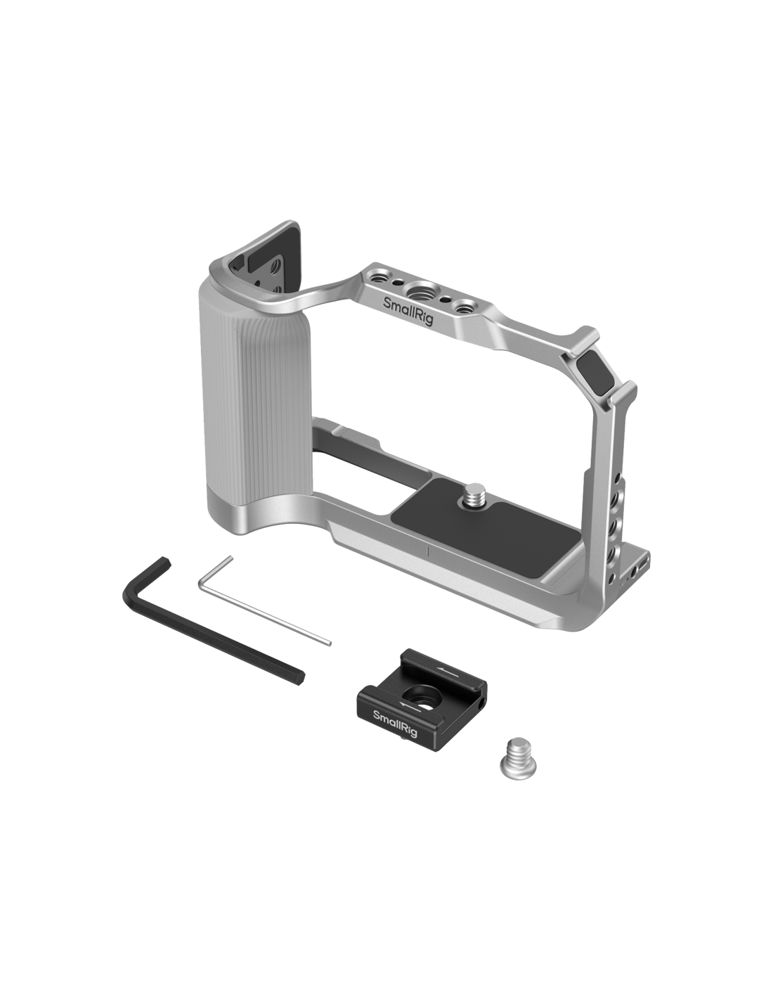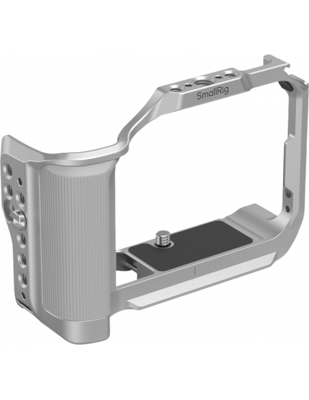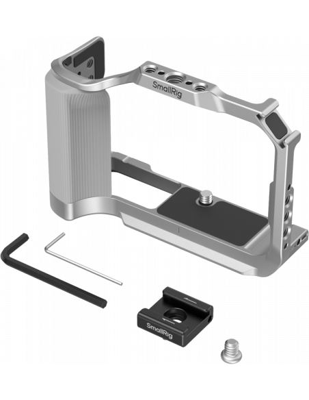 SmallRig 5428 Cage for Canon EOS R50 V Silver  Buret fastgøres til kameraet med to 1/4"-20-skruer (i bunden og i siden) for sikker låsning uden afbøjning, mens integrerede indvendige silikonepuder forhindrer ridser.   Det ergonomiske silikonehåndtag forbedrer grebskomforten og skydestabiliteten betydeligt.Den integrerede Arca-Swiss-plade i bunden letter hurtige overgange mellem håndholdte, stativ- og DJI RS-stabilisatoropsætninger.   Det har flere udvidelsesgrænseflader, herunder et 1/4"-20-gevindhul på håndtagets side til fastgørelse af ekstra greb i stående retning, samt indbyggede 1/4"-20-gevindhuller, 1/4"-20-lokaliseringshuller, ARRI 3/8"-16-lokaliseringshuller, koldskobeslag, stropslidser og QD-stik til tilslutning af tilbehør som SmallRig-håndtag, mikrofoner, fill-lys, skulderremme og håndledsremme.Dette præcisionsdesignede bur sikrer uhindret adgang til kameraets knapper, batterirum, kortpladser eller andre grænseflader.  Dertil kommer et aftageligt koldskofæste, som kan sættes på ethvert 1/4"-20-lokaliseringshul på buret, hvilket yderligere forbedrer udvidelsesmulighederne.  Kompatibilitet:Canon EOS R50 VPakken indeholder:BurAftagelig koldskofatning2x unbrakonøgle1/4"-20-skrue