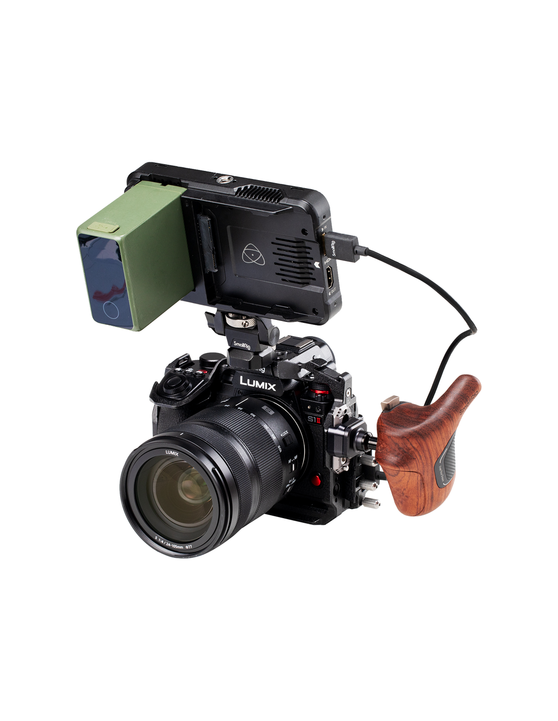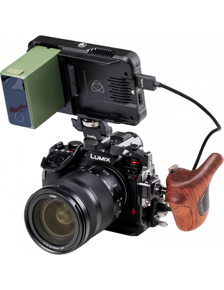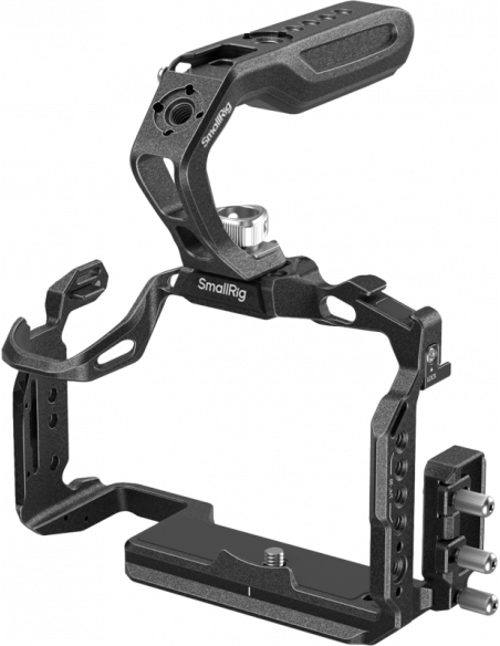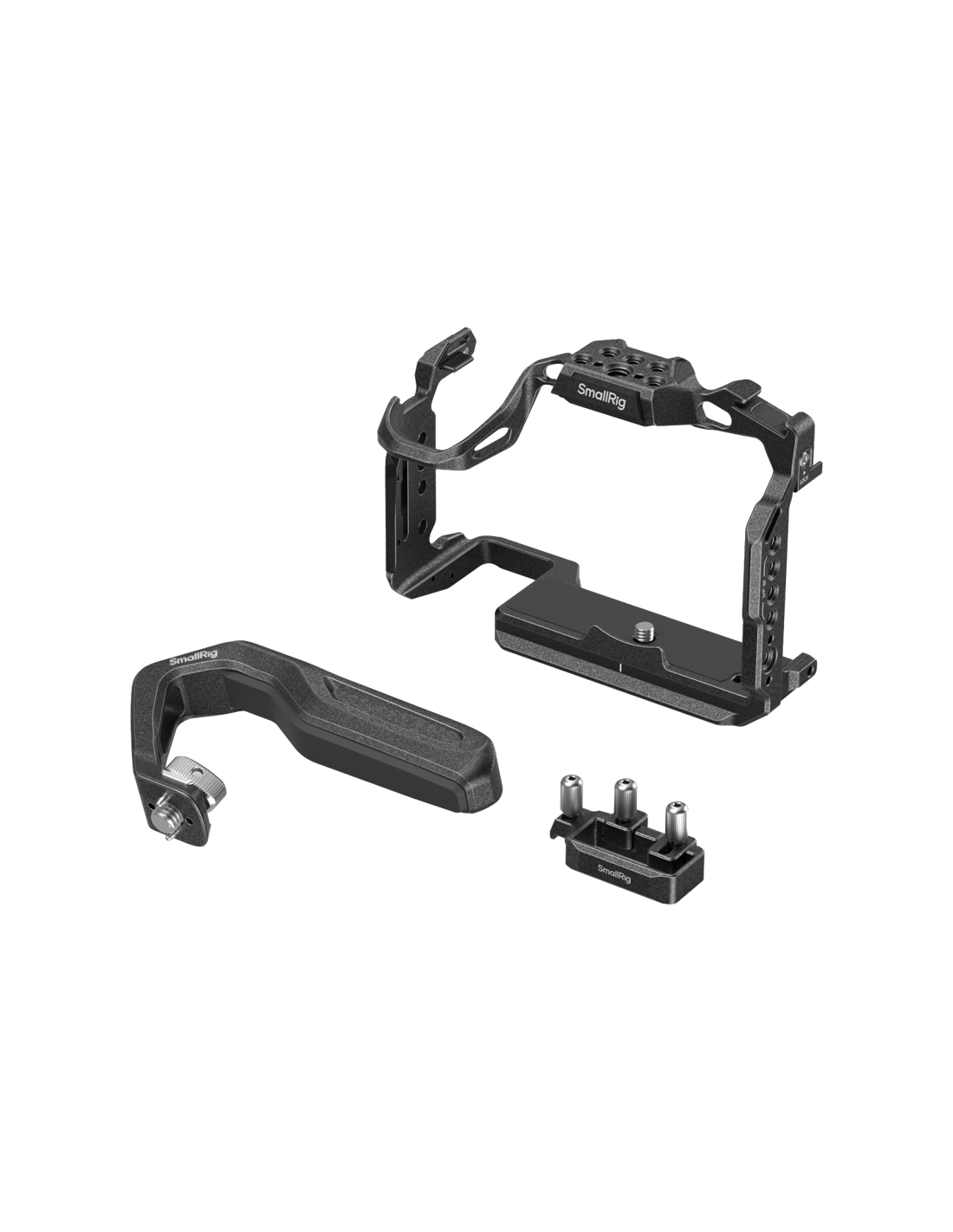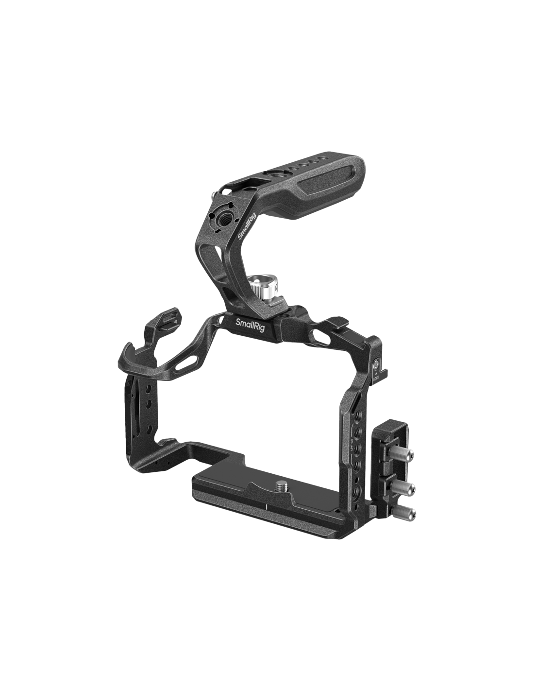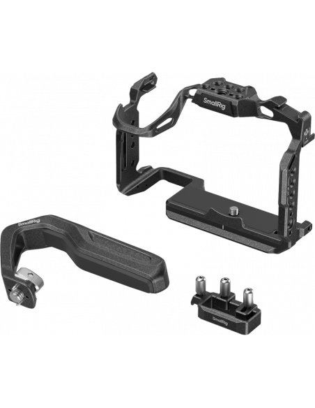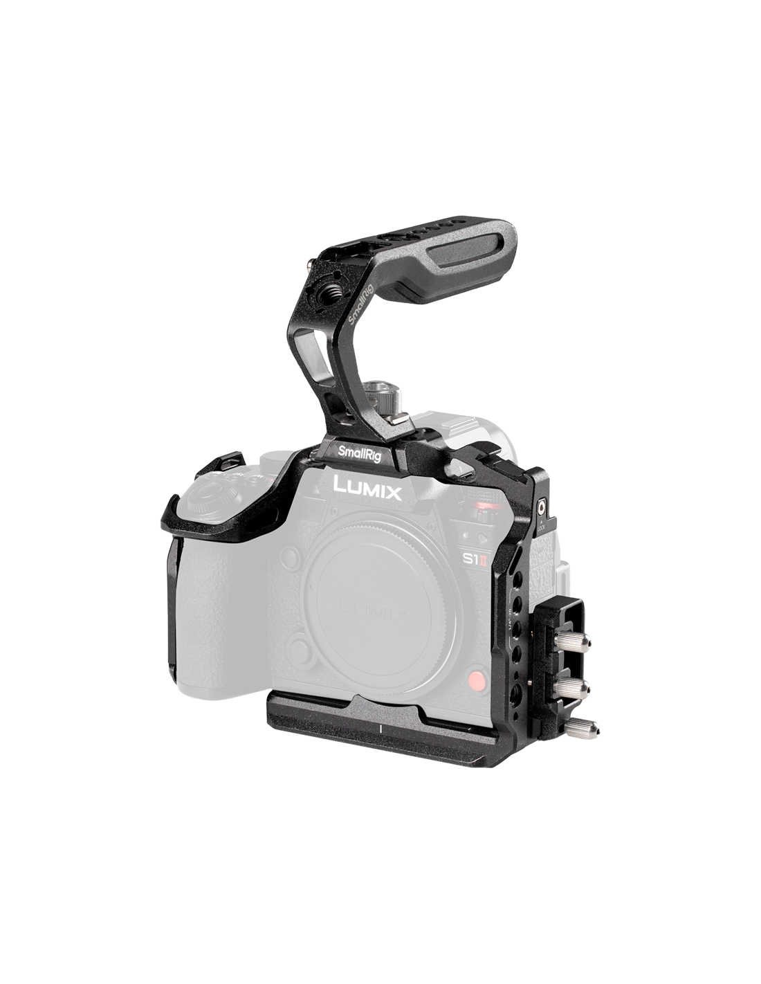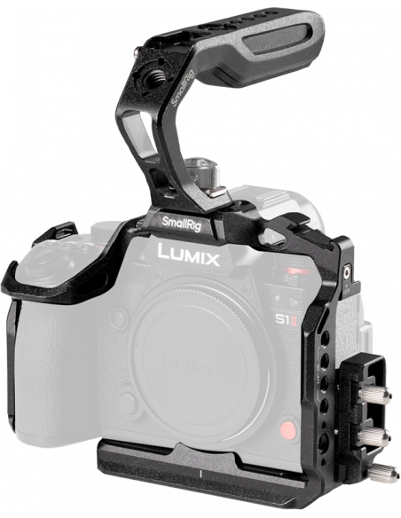 SmallRig 5503 Black Mamba Cage Kit til Panasonic S1R II / S1 II / S1 IIE Det ergonomiske tophåndtag giver et behageligt greb for nem transport og optagelse i lav vinkel.Buret har et slankt, strømlinet design med præcisionsdesignede åbninger, der giver fuld adgang til alle kameraknapper for problemfri kontrol. Kabelklemmen fastgør både HDMI- og USB-C-kabler med fingerskruer, hvilket muliggør problemfri og værktøjsfri justeringer.For at forbedre funktionaliteten er buret og det øverste håndtag udstyret med flere 1/4"-20-gevindhuller og ARRI 3/8"-16-placeringshuller til fastgørelse af forskelligt tilbehør, f.eks. øverste håndtag, powerbankholdere og monitorbeslag. Flere cold shoe-beslag giver mulighed for montering af mikrofoner og lys, mens en NATO-skinne på burets venstre side har plads til roterende NATO-sidehåndtag.Den indbyggede Arca-Swiss-baseplate muliggør direkte montering på stativer af Arca-typen og DJI RS-stabilisatorer (RS 2 / RSC 2 / RS 3 Pro / RS 3 / RS 4 Pro / RS 4 / RS 4 Mini).Yderligere gevindhuller i bunden sikrer kompatibilitet med quick release-plader til DJI RS 2 / RSC 2 og Arca-Swiss quick release-plader.Buret har også stropåbninger på begge sider til fastgørelse af "Black Mamba"-håndledsremme. Der medfølger desuden en magnetisk dobbelthovednøgle til nem montering og demontering.Kompatibilitet:LUMIX S1R IILUMIX S1 IILUMIX S1 IIEPakken indeholder:BurTophåndtagHDMI & USB-C-kabelklemmeAllen WrenchBrugervejledning