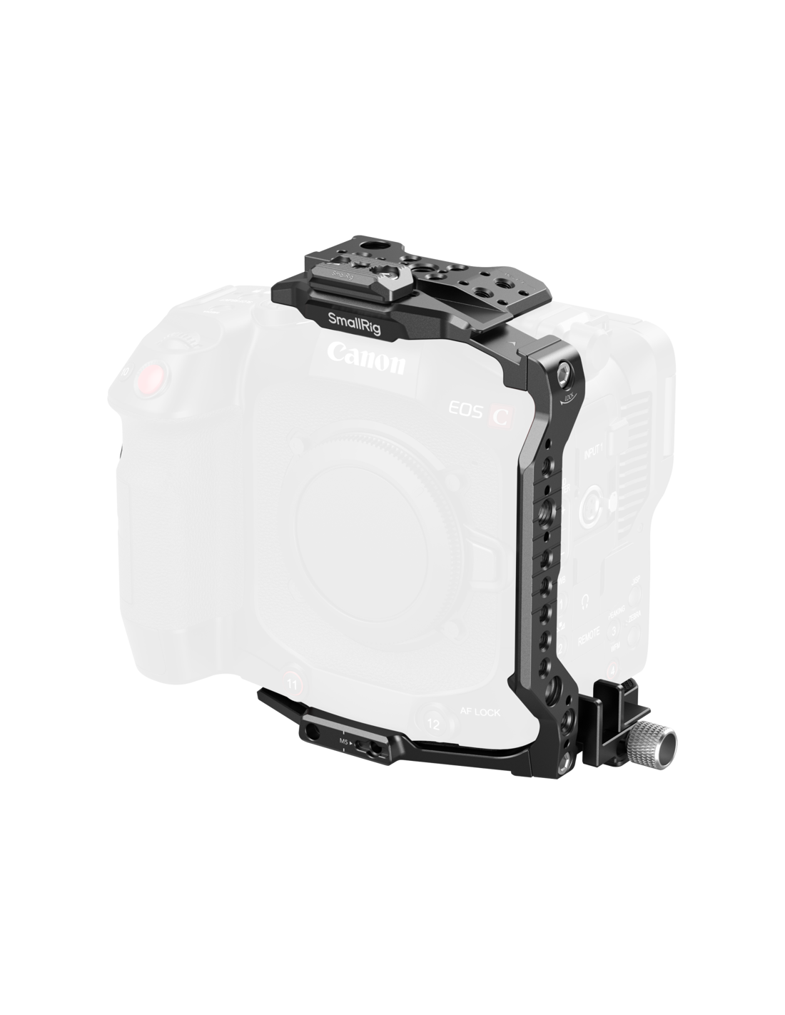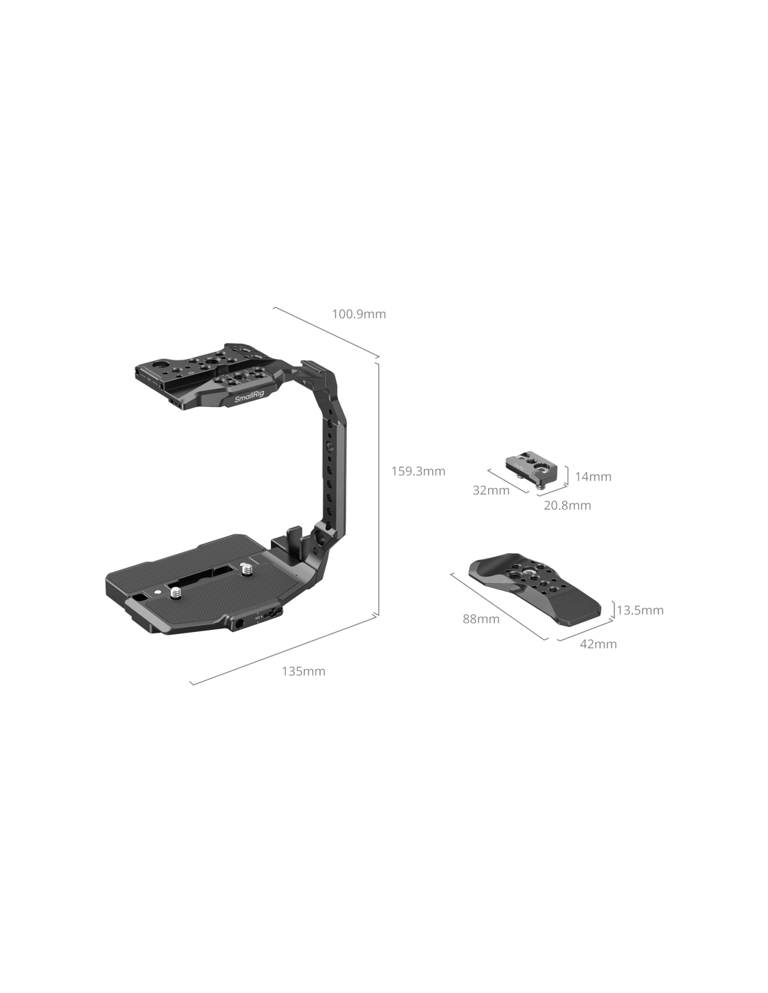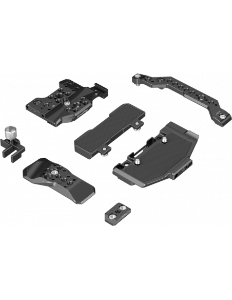 SmallRig 5810 Cage til Canon EOS C80Buret har et modulært design og indeholder en række forskellige monteringsgrænseflader: 1/4"-20 og 3/8"-16 gevindhuller, 1/4"-20 placeringshuller, ARRI 3/8"-16 placeringshuller, M3 gevindhuller, cold shoe mounts, H21 NATO-skinner, QD-stik og meget mere. Denne omfattende kompatibilitet giver mulighed for problemfri integration med SmallRig-sidehåndtag, magiske arme, monitorbeslag, basisplader med dobbelte stangklemmer og follow focus stangklemmer.Den modulære baseplate tilbyder to konfigurationer: Sættes den nederste monteringsplade på, udvides afstanden mellem gevindhullerne, hvilket gør den kompatibel med stativer, ARRI BP8-broplader, LWS-baseplates med dobbelte stangklemmer og skulderrigge, hvilket gør den velegnet til både stativ- og skuldermonterede opsætninger. Eller - Fjernelse af monteringspladen giver mulighed for direkte montering på DJI RS 2, RS 3 Pro og RS 4 Pro gimbals.Den ergonomiske højre sideplade forbedrer grebet og har flere gevindhuller til fastgørelse af tilbehør som stativer eller mini L-formede monteringsplader.   Den modulære NATO-skinne, der er designet med matchende riller, så den passer til det originale håndtag, kan monteres på toppen og siderne af buret for problemfri vandret og lodret fotografering.Dette burkit er kompatibelt med Canons mikrofonholdere, kroge til markering af fokusplan og ledninger til kamerasko (OC-E4A). Sættet indeholder desuden en HDMI-kabelklemme til stabil dataoverførsel og en magnetisk unbrakonøgle til nem montering og demontering.Kompatibilitet:Canon EOS C80Pakken indeholder:ToppladeVenstre pladeHøjre pladeBaseplateBottom Mount PlateKabelklemmeNATO RailBetjeningsvejledning
